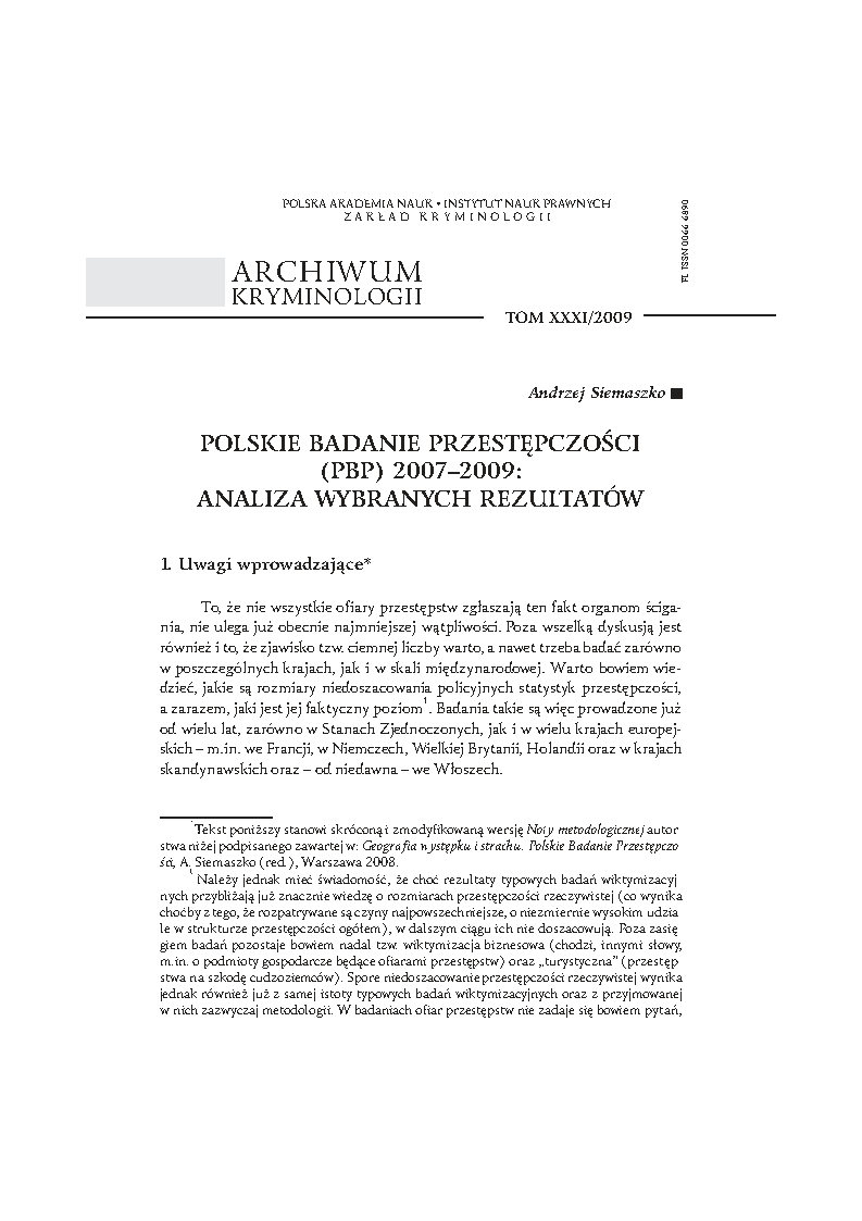 - Siemaszko A., Przestępczość nieujawniona. Porównanie rezultatów ICVS ’92 i ’96, „Archiwum Kryminologii” 1997-1998, s. 45-74, https://doi.org/10.7420/AK1997-1998B.