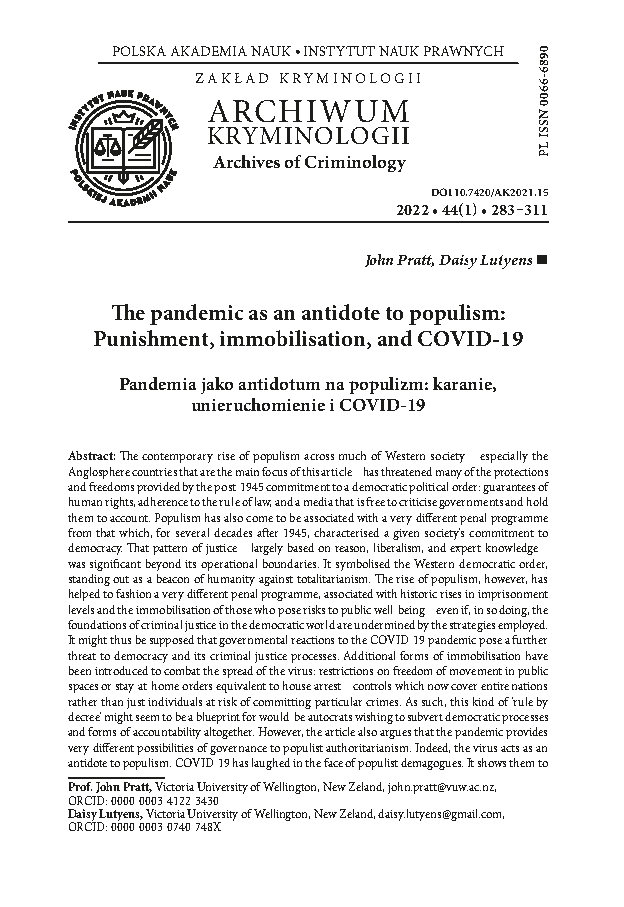 Współczesny wzrost populizmu w znacznej części społeczeństw zachodnich – zwłaszcza w krajach anglosaskich, na których koncentruje się niniejszy artykuł – zagraża wielu prawom i wolnościom wprowadzonym po 1945 roku do demokratycznego ustroju politycznego, w tym: gwarancjom praw człowieka, przestrzeganiu praworządności oraz swobodzie krytykowania rządu przez media i pociągania go do odpowiedzialności. Obecnie populizm zaczął być kojarzony z zupełnie inną polityką kryminalną, niż ta, która przez kilkadziesiąt lat przed 1945 rokiem charakteryzowała się zaangażowaniem społeczeństwa w demokrację. Ten wzorzec sprawiedliwości – w dużej mierze oparty na racjonalizmie, liberalizmie i wiedzy eksperckiej – miał znaczenie także poza granicami jego obowiązywania. Symbolizował zachodni porządek demokratyczny, wyróżniający się jako wzorzec przeciwko totalitaryzmowi. Jednak wzrost populizmu pomógł ukształtować zupełnie inną politykę kryminalną, związaną z historycznym wzrostem orzekanych kar pozbawienia wolności i izolacją tych, którzy stanowią zagrożenie dla dobrobytu publicznego – nawet jeśli obowiązujące strategie podważają taki sposób postepowania w sprawach karnych w demokratycznym świecie. Można zatem przypuszczać, że reakcje rządów na pandemię COVID-19 stanowią kolejne zagrożenie dla demokracji i procesów karnych. W celu przeciwdziałania rozprzestrzenianiu się wirusa wprowadzono dodatkowe ograniczenia mobilności: ograniczenie swobody poruszania się w przestrzeni publicznej lub nakaz pozostania w domu równoznaczny z aresztem domowym – a zatem kontrole, które obecnie obejmują całe społeczności, a nie tylko osoby mogące popełnić przestępstwo. Tego rodzaju rządzenie dekretami, pomijające parlamenty i oddające w ręce rządu władzę do przedłużania sytuacji wyjątkowych, mogą stanowić wzorzec dla niedoszłych autokratów, chcących całkowicie obalić demokratyczne procesy i formy odpowiedzialności. Jednak, jak wynika z niniejszego artykułu, pandemia daje również zupełnie inne możliwości rządzenia niż autorytarny populizm. Wirus działa jak antidotum na populizm. COVID-19 wyśmiał populistycznych demagogów, pokazując, że są tylko niekompetentnymi, choć zwykle wrogimi, szarlatanami, którzy jednak przyczynili się do jednych z najwyższych na świecie wskaźników zachorowań i zgonów w swoich społeczeństwach. Pandemia może zostać wyeliminowana nie dzięki ich pustym, populistycznym hasłom, a dzięki nauce i wiedzy eksperckiej, działającej w połączeniu z silnym, ale poddanym kontroli rządem. Będzie on decydował o ograniczaniu mobilności, jednak w sposób, na który zgodzi się ogół społeczeństwa, co w wielu przypadkach przyczyni się do wzmocnienia, a nie osłabienia spójności społecznej. Ponieważ wirus osłabił poparcie dla populizmu, zagrożenia, jakie ten ostatni stwarzał dla porządku demokratycznego, również zostały zminimalizowane. Po poprzednich pandemiach nastąpiły drastyczne zmiany społeczne i gospodarcze. Takie zmiany po COVID-19 mogą zerwać powiązania między populizmem a rozwojem polityki kryminalnej, pozwalając na wprowadzanie innych, bardziej ograniczonych ram dla tej polityki.