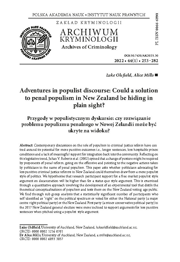 Contemporary discussions on the role of populism in criminal justice reform have centred around its potential for more punitive outcomes i.e., longer sentences, less hospitable prison conditions and a lack of meaningful support for integration back into the community. Reflecting on this legislative trend, Julian V. Roberts et al. (2002) opined that a change of posture might be required by proponents of penal reform, going on the offensive and pointing to the negative actions taken by politicians in the name of penal populism. This paper asks whether politicians advocating for less punitive criminal justice reforms in New Zealand could themselves draw from a more populist style of politics. We hypothesise that research participant support for a free-market populist-style argument on decarceration will be higher than for a status quo-style argument. This is examined through a quantitative approach involving the development of an experimental tool that distils the theoretical conceptualisations of populism and tests them on the New Zealand voting-age public. We find through sub-group analysis that a statistically significant number of participants who self-identified as “right” on the political spectrum or voted for either the National party (a major centre-right political party) or the New Zealand First party (a minor conservative political party) in the 2017 New Zealand general election were more inclined to support arguments for less punitive sentences when pitched using a populist-style argument.