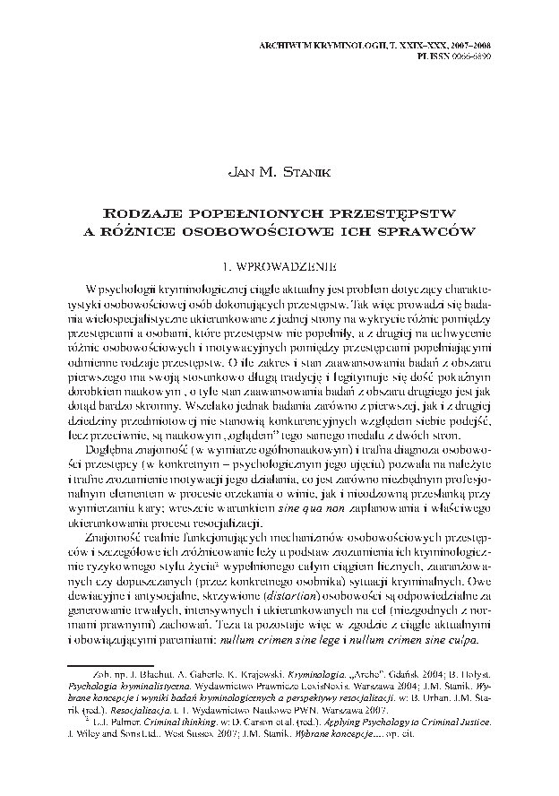 In his article, Stanik discusses the issue of identifying the differences in the personalities of offenders who commit different types of crimes, which would make it possible to understand the motivation behind their actions. In the author’s opinion, it is an indispensable element in the proper execution of the trial, punishment, and effective course of rehabilitation. The text presents research on a group of 129 people convicted of beating, robbery, assault with robbery, and burglary who were beingheld in the semi-open penitentiary in Wojkowice with restrictive and liberalised regimes. The study was conducted using three psychological inventories: the IBZO DSM-IV by Radochoński and Stanik, the SABD by Buss-Durkee, and the SUI by Stanik. A detailed description of each of the above questionnaires is included in the text as an introduction to the analysis of the research findings, which are presented in tables and show the differences between the convicts who committed the above-mentioned crimes. The text also interprets the results. According to the author, perpetrators of theft and burglary are characterised by deeply rooted attitudes of distrust and suspicion and negation of social and legal requirements. For this reason, according to the author, these crimes are not sporadic. The author also refers to the doctoral dissertation of Kucharewicz (Psychologiczna analiza procesów motywacyjnych przestępstw popełnionych przez nieletnich [A psychological analysis of motivational processes in crimes committed by minors]), which reports the results of research carried out on a group of 36 minors. In conclusion, it can be found that in the majority of the respondents criminal behaviour is motivated by personality mechanisms and not by variable situations.