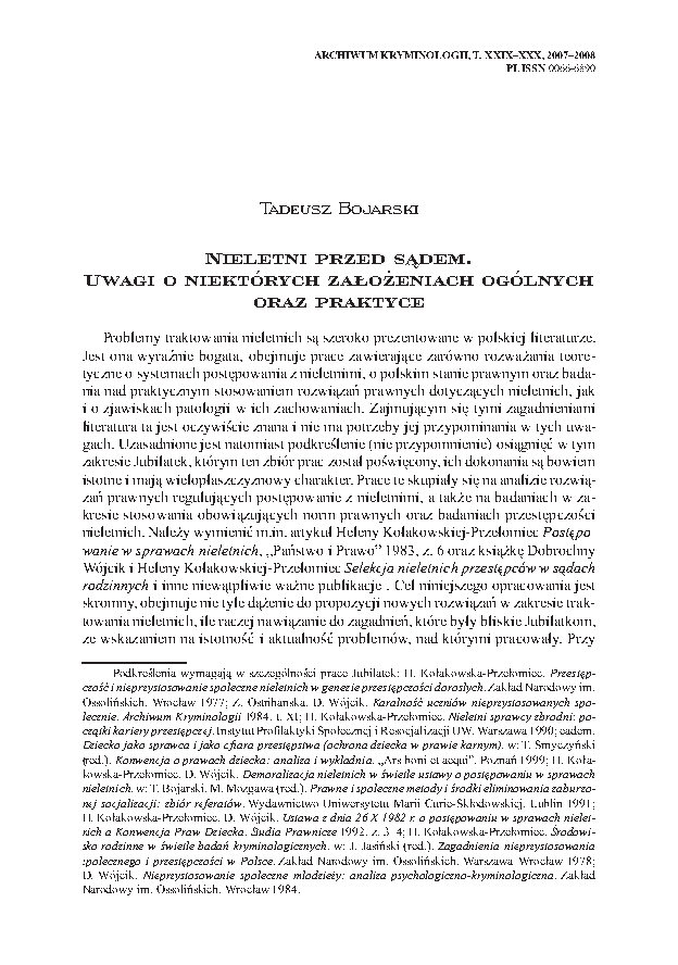 The purpose of the article is to examine the treatment of minors by Polish courts, pointing out the essence and relevance of this issue. The article covers the practice of Polish courts in dealing with minors from the 16th century until the 21st century. The author also raises the issue of differences in the treatment of minors accused of delinquency and those prosecuted for committing a punishable act. In the text Tadeusz Bojarski also carries out a comparative analysis of juvenile cases in courts and the types of acts committed by juvenile sand discusses the breakdown of measures handed down to them on the basis of data from the Statistics Division of the Ministry of Justice between 1999 and 2004. In conclusion, the author draws attention to the increase in unruly behaviour among minors since the early 1980s. According to Bojarski, the main reasons for this trend are a decrease in the effectiveness of educational measures taken in conjunction with a decline in moral social principles, an increase in adult crime, and high unemployment.