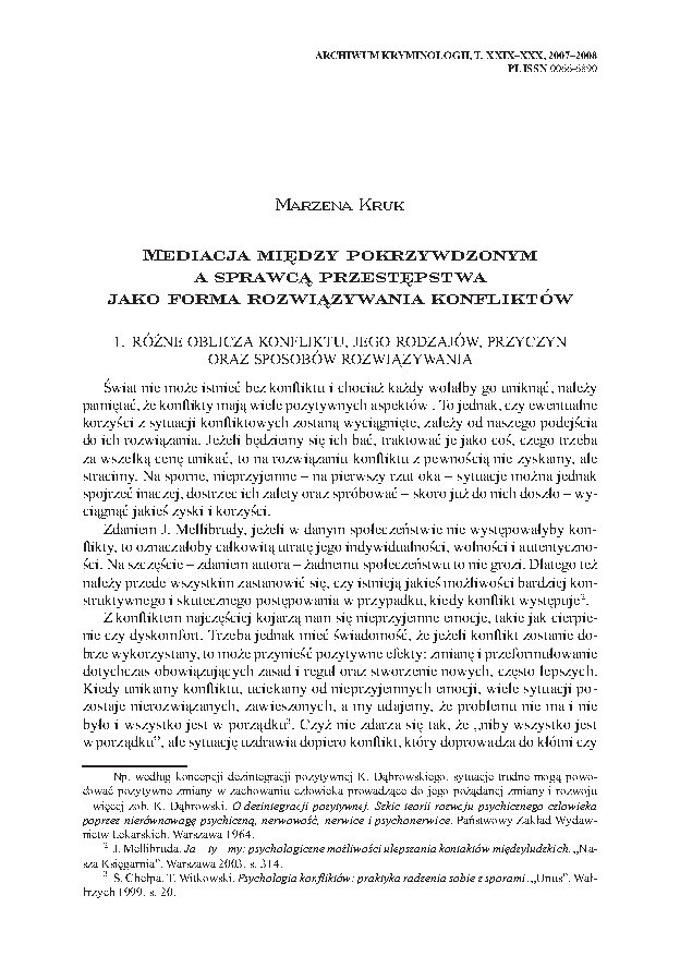 - Czarnecka-Dzialuk B., Teoretyczne podstawy mediacji między ofiarą a sprawcą przestępstwa, „Archiwum Kryminologii” 1999-2000, t. XXV, s. 9–28, https://doi.org/10.7420/AK1999-2000A.