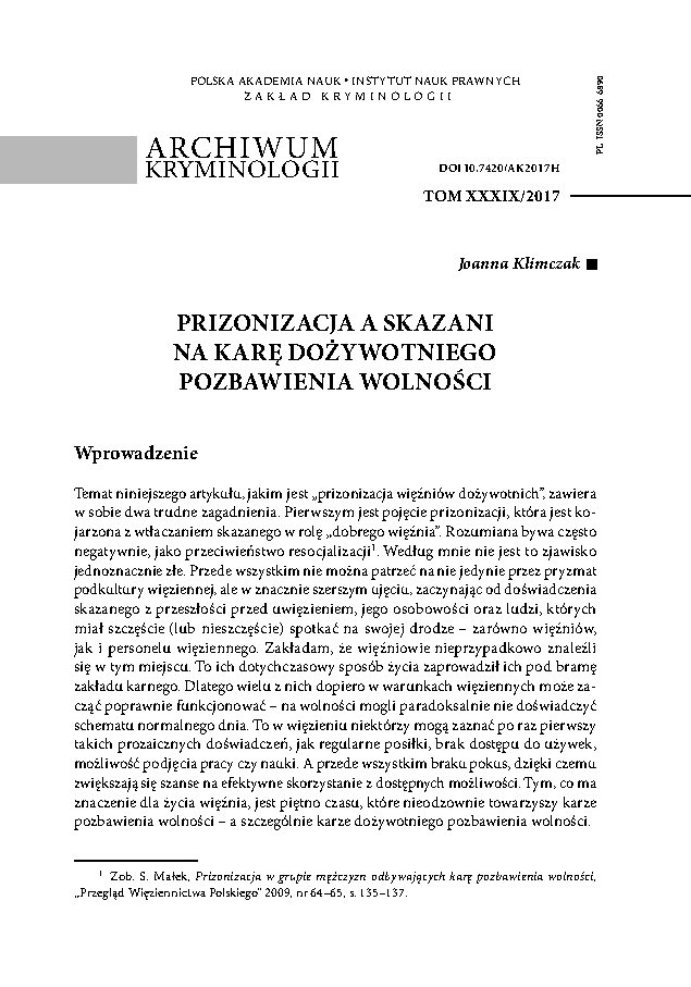 “Prisonisation and Individuals Sentenced to Life in Prison” (2017) Archives of Criminology, (XXXIX), pp. 231–248. doi:10.7420/AK2017H.