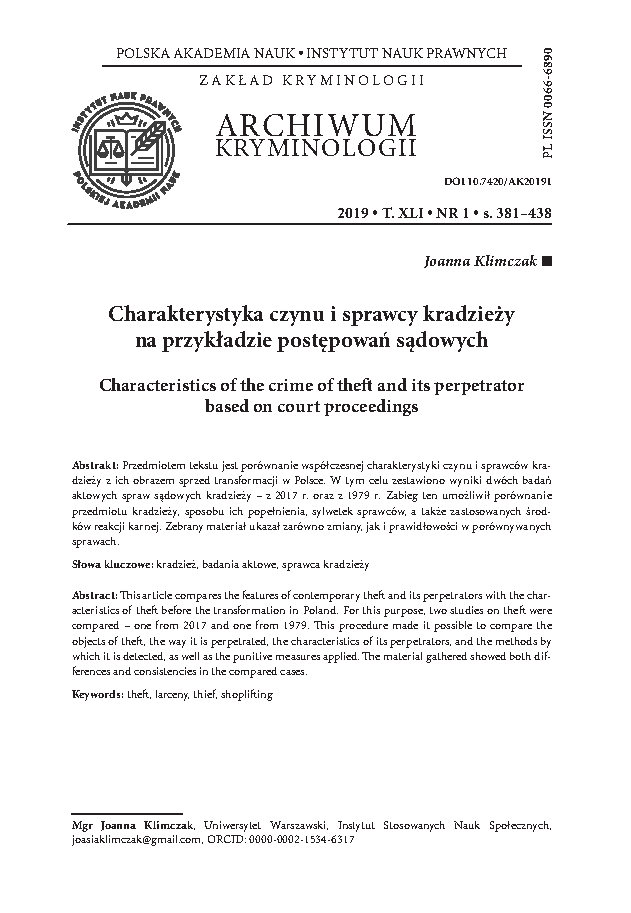 Przedmiotem tekstu jest porównanie współczesnej charakterystyki czynu i sprawców kradzieży z ich obrazem sprzed transformacji w Polsce. W tym celu zestawiono wyniki dwóch badań aktowych spraw sądowych kradzieży – z 2017 r. oraz z 1979 r. Zabieg ten umożliwił porównanie przedmiotu kradzieży, sposobu ich popełnienia, sylwetek sprawców, a także zastosowanych środków reakcji karnej. Zebrany materiał ukazał zarówno zmiany, jak i prawidłowości w porównywanych sprawach.