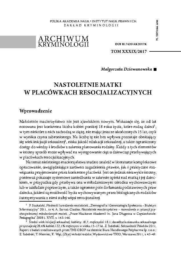 GUS (Polish Central Statistical Office) statistics indicate that around 3.5% of children born in 2014, that is some 13,000 children, were born to teenage mothers. Out of this number, around 50-60 children were born to 13-14-year-olds, which means that the pregnancy had resulted from a criminal offense. These figures are also due to the decreasing age of sexual initiation among youth, a low quality or absence of sexual education in schools, as well as limited access to information and family planning. The current legal framework and circumstances also impact the condition of young women who get pregnant while in the care of rehabilitation centres. It is difficult to find comprehensive publications devoted to teenage mothers – girls who were placed in a youth care or a juvenile centre due to having committed a criminal offense or because of profound demoralisation – that would discuss both the legal issues and practical solutions applied in different centres. The problem is an important one, however, because it highlights systemic shortcomings when it comes to supporting mothers and babies in such institutions as well as the vast room that is left for violations of children’s basic rights, such as the right to be brought up by one’s biological parents and to maintain an unbroken emotional bond with them. The article examines the legal status of teenage mothers and the practical solutions applied at different rehabilitation centres. The aim is to present all the possibilities of helping teenage mothers in the care of youth care centres or juvenile centres, who are going through crisis and require external support, for example in the form of basic legal provisions and solutions regarding the placement and stay of juveniles in rehabilitation centres, the types of rehabilitation measures available or subsequent public help for young women leaving such centres. The Author discusses Polish legal provisions designed to protect motherhood as well as a range of important issues related to juvenile pregnancy, such as school duty or access to medical services. Also discussed are the state’s most recently adopted measures to support motherhood, showing a need to provide additional aid for this group of beneficiaries, with particular emphasis on access to benefits for juvenile mothers living in rehabilitation centres. The article also presents practical solutions introduced by the staff at different centres, aiming to fill the gaps in the law when it comes to acknowledging the bond between a biological, though juvenile, mother and her child, which often isn’t appreciated enough. The featured examples are drawn from information collected by Po DRUGIE Foundation which helps former residents of rehabilitation centres, as well as from ethnographic research carried out for a current project to set up a care institution for juvenile pregnant women and juvenile women with children, allowing them to continue their rehabilitation beyond a centre. The article highlights numerous state measures to provide multi-faceted support for motherhood and parenthood in Poland, while at the same time pointing to the systemic discrimination of girls from juvenile centres, who are thoughtlessly deprived of the chance to take responsibility for their children or, if given such a chance, lose the support of the institutions obligated to resocialise them. The Po DRUGIE Foundation project aims to fill these gaps, both in the law, by developing provisions to provide care both for juvenile mothers and their children, and on the ground, by setting up an institution dedicated to this group of recipients.