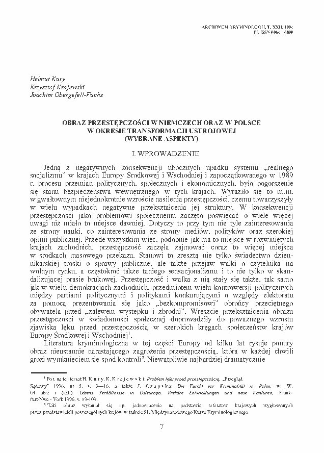 Among the negative side-effects of the fall of "Realsozialismus" in Central and Eastern Europe and the process of political, social and economic transformations initiated in 1989 there was a deterioration of internal safety in those countries. According to a popular opinion, this was manifested, among other things, by a growth - a rapid one in many instances - in the extent and intensity of crime, and also in negative changes of its structure which consisted in a particularly fast growth of tle most serious crime or emergence of its new and very dangerous forms, hitherto unknown in those countries. From this viewpoint, criminological literature in all those countries without exception has recently been presenting an extremely pessimistic picture of a growing threat of crime which can at any moment get out of control. As a consequence, fear of crime is growing in societies involved, and appeals can be heard more and more often from politicians that “law and order” be instituted.