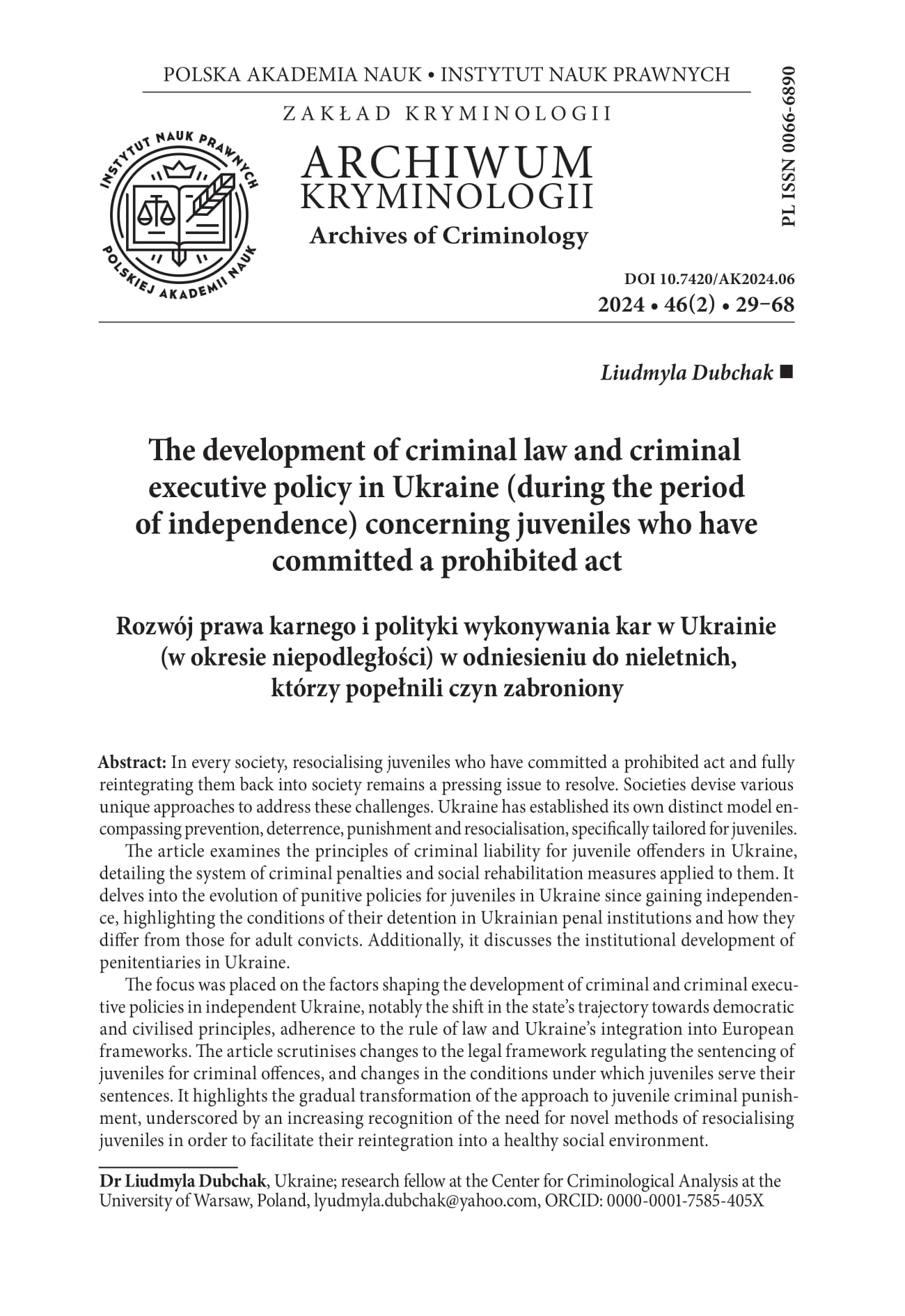 - Dubchak L. (2021). ‘Formation of international legal standards in the field of rights protection of convicted juveniles and their implementation in Ukraine.’ In M.H. Kowalczyk, D. Mackojć (eds.) Karanie, terapia, resocjalizacja. W poszukiwaniu najlepszych rozwiązań [Punishment, therapy, resocialization. In search of the best solutions]. Toruń: Wydawnictwo Naukowe UMK, pp. 117–136.