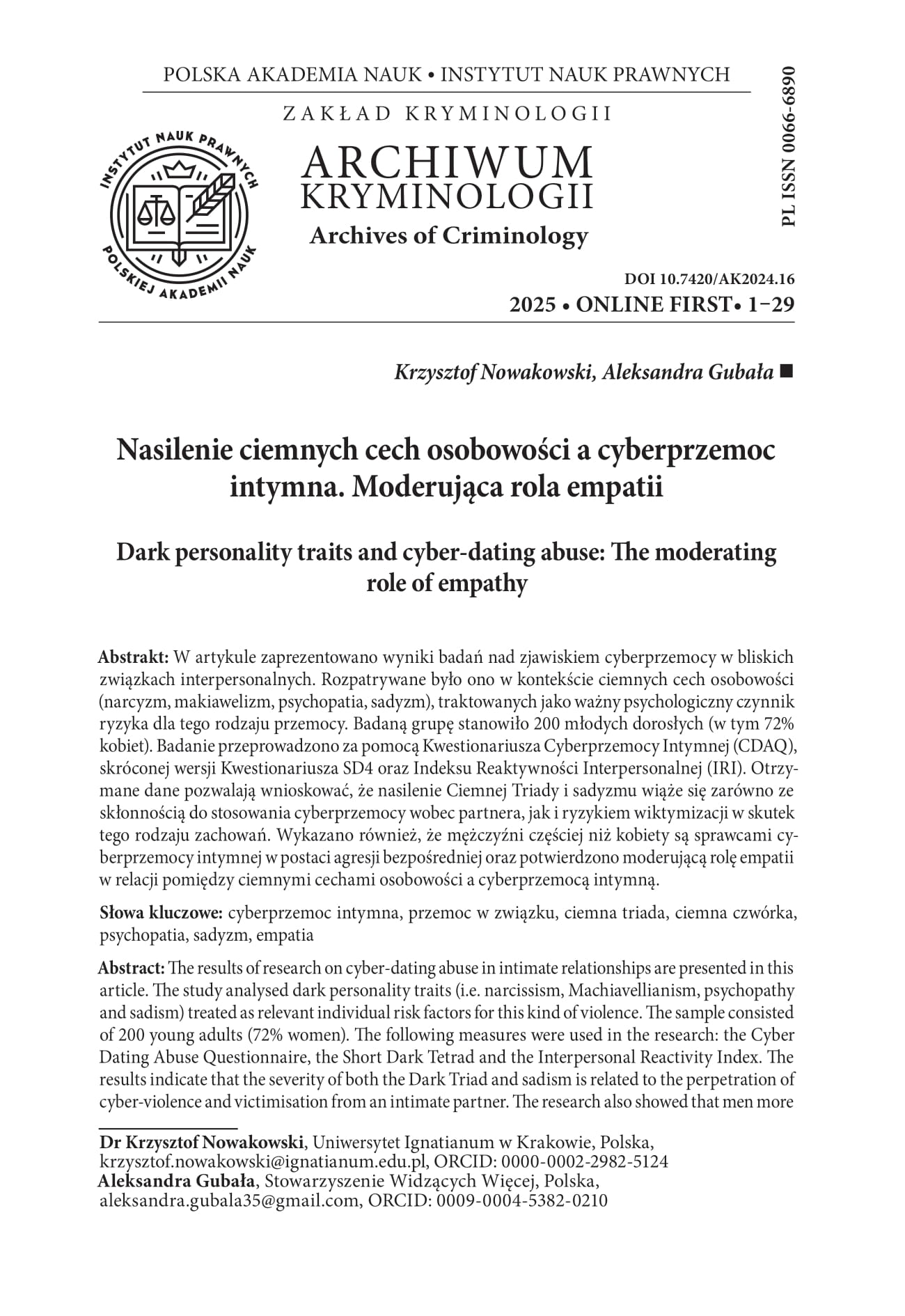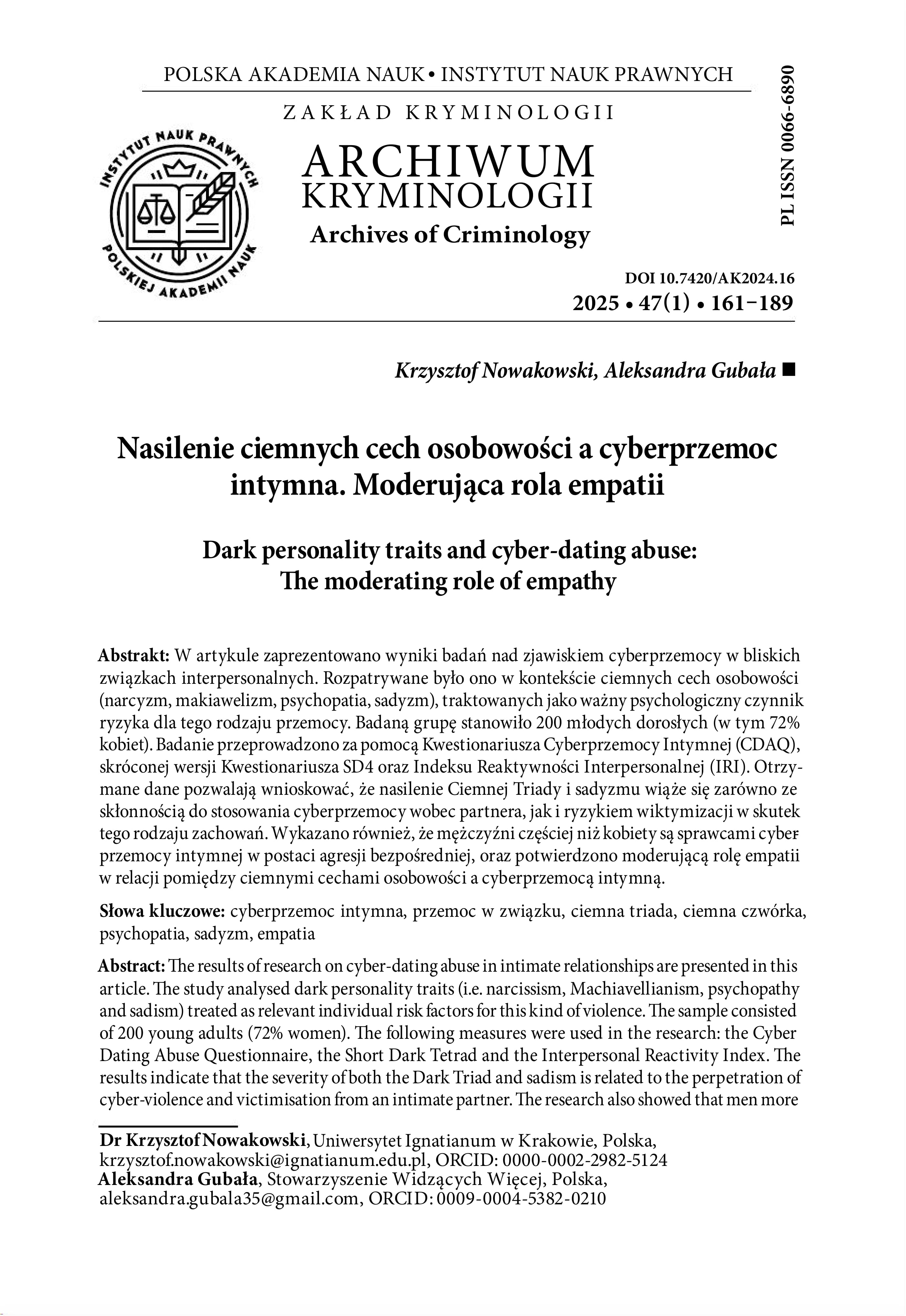 The results of research on cyber-dating abuse in intimate relationships are presented in this article. The study analysed dark personality traits (i.e. narcissism, Machiavellianism, psychopathy and sadism) treated as relevant individual risk factors for this kind of violence. The sample consisted of 200 young adults (72% women). The following measures were used in the research: the Cyber Dating Abuse Questionnaire, the Short Dark Tetrad and the Interpersonal Reactivity Index. The results indicate that the severity of both the Dark Triad and sadism is related to the perpetration of cyber-violence and victimisation from an intimate partner. The research also showed that men more often than women use direct aggression in cyber-dating abuse. Moreover, the moderating role of empathy in the relationship between dark personality traits and cyber-dating abuse was confirmed.