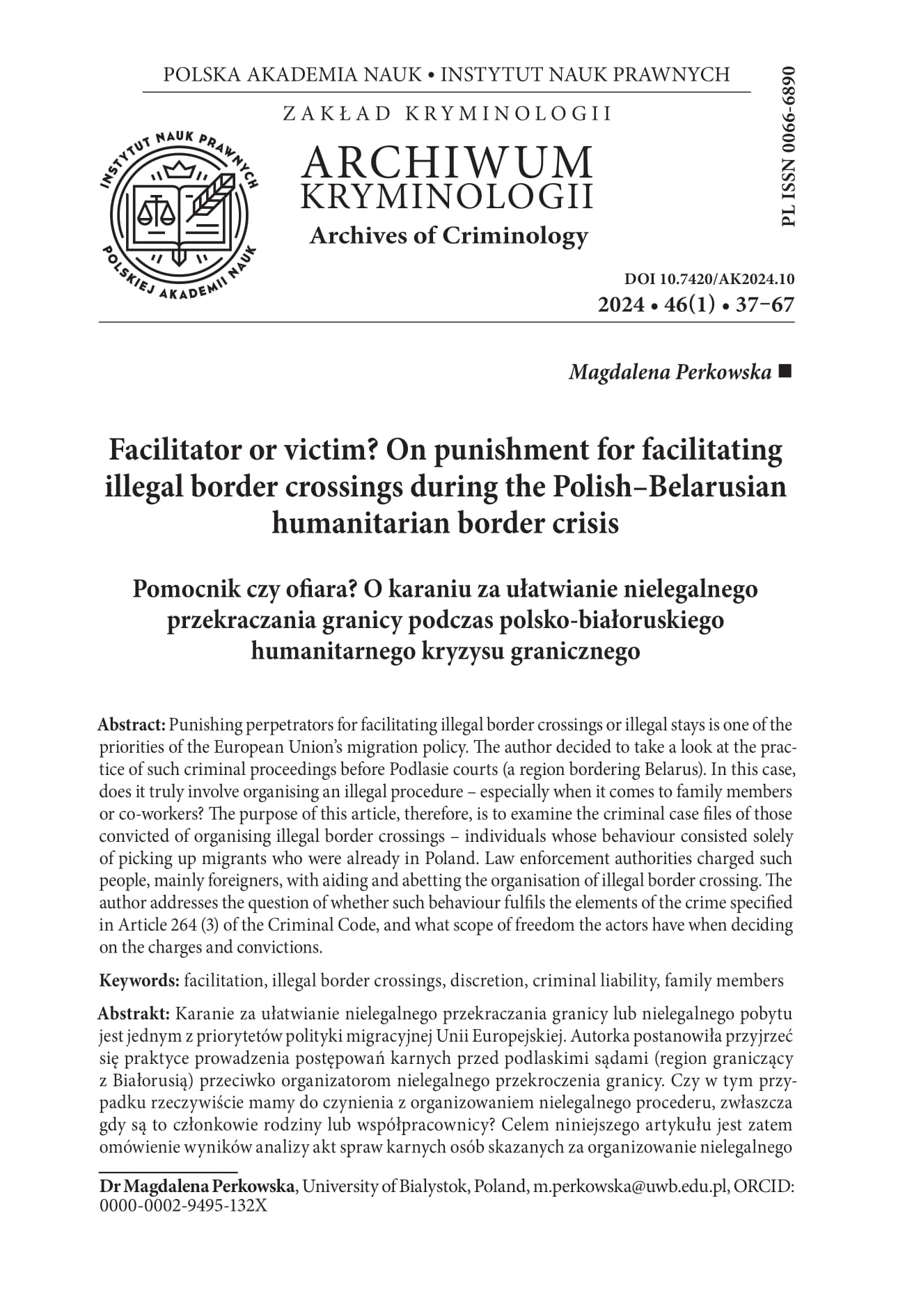 - Perkowska M. (2013). ʻPrawne i kryminologiczne aspekty dekryminalizacji przestępstwa nielegalnego przekroczenia granicyʼ [Legal and criminological aspects of the decriminalisation of the offence of illegal border crossing]. In S. Pikulski and M. Romańczuk-Grącka (eds.) Granice kryminalizacji i penalizacji [Limits to criminalisation and penalisation]. Olsztyn: Wydawnictwo Uniwersytetu Warmińsko-Mazurskiego, pp. 505–515.