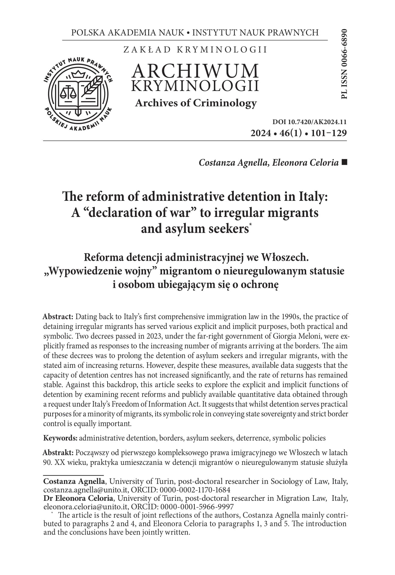 Począwszy od pierwszego kompleksowego prawa imigracyjnego we Włoszech w latach 90. XX wieku, praktyka umieszczania w detencji migrantów o nieuregulowanym statusie służyła różnym jawnym i ukrytym celom, zarówno praktycznym, jak i symbolicznym. Dwa dekrety przyjęte w 2023 r., pod rządami skrajnie prawicowego rządu Giorgii Meloni, zostały wyraźnie sformułowane jako odpowiedź na rosnącą liczbę migrantów przybywających na granice kraju. Celem tych dekretów było przedłużenie detencji osób ubiegających się o ochronę i migrantów o nieuregulowanym statusie, by zwiększyć liczbę powrotów. Jednak pomimo tych środków, dostępne dane sugerują, że pojemność ośrodków detencyjnych nie wzrosła znacząco, a wskaźnik powrotów pozostał stabilny. W tym kontekście niniejszy artykuł ma na celu zbadanie jawnych i ukrytych funkcji detencji poprzez analizę ostatnich reform i publicznie dostępnych danych ilościowych uzyskanych na wniosek na podstawie włoskiej ustawy o wolności informacji. Sugeruje on, że podczas gdy w odniesieniu do mniejszości migrantów detencja służy praktycznym celom, jej symboliczna rola w zapewnianiu suwerenności państwa i ścisłej kontroli granic jest równie ważna.