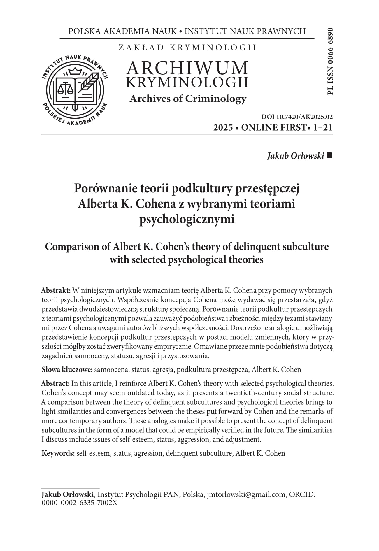 In this article, I reinforce Albert K. Cohen’s theory with selected psychological theories. Cohen’s concept may seem outdated today, as it presents a twentieth-century social structure. A comparison between the theory of delinquent subcultures and psychological theories brings to light similarities and convergences between the theses put forward by Cohen and the remarks of more contemporary authors. These analogies make it possible to present the concept of delinquent subcultures in the form of a model that could be empirically verified in the future. The similarities I discuss include issues of self-esteem, status, aggression, and adjustment.