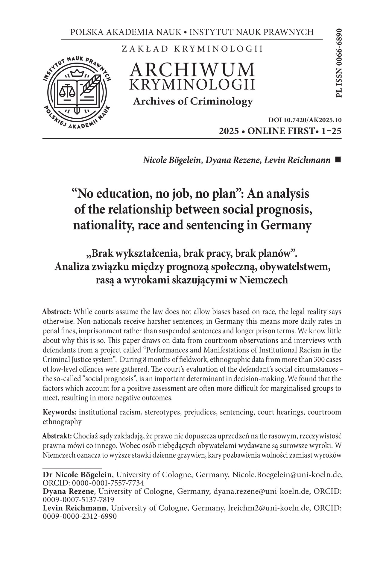 - Bögelein N. and Rezene D. (2023). ʻZeigt sich im Gerichtssaal Institutioneller Rassismus? Hinführende Überlegungen zu einem Forschungsprojektʼ [Justice and Institutional Racism – project to research institutional racism in judicial proceedings]. Neue Kriminalpolitik 35(4), pp. 528–544. https://doi.org/10.5771/0934-9200-2023-4-528.
