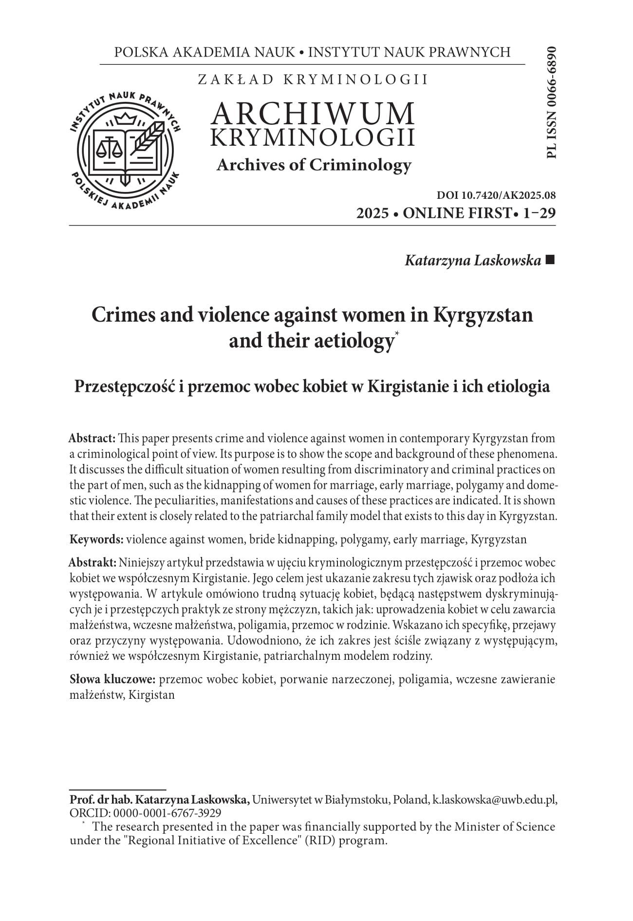 This paper presents crime and violence against women in contemporary Kyrgyzstan from a criminological point of view. Its purpose is to show the scope and background of these phenomena. It discusses the difficult situation of women resulting from discriminatory and criminal practices on the part of men, such as the kidnapping of women for marriage, early marriage, polygamy and domestic violence. The peculiarities, manifestations and causes of these practices are indicated. It is shown that their extent is closely related to the patriarchal family model that exists to this day in Kyrgyzstan.