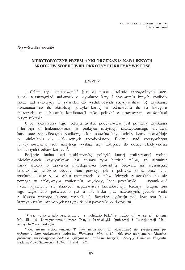 The present work has been based on the author's own research and to a minimum extent only on the analysis of the national statistical data. The point of departure for the study of the actual conditions of the courts decisions were the conditions specified in the Penal Code now in force. The conditions specified in Art. 61 of the Penal Code and related to the offender only have been assumed to form the ratio legis of special recidivism in the Polish penal legislation. If, however, when aplying this provision, the courts prefer the conditions related to the most recent act of the offender, this mignt be an indication of their different attitude towards the aim of punishment in the case of the discussed category of offenders. The existence of such divergences between the conditions of application of Art 61 of the Penal Code as included in the law on the one hand, and those applied by the courts on the other hand has been one of the hypotheses verified in the present study.