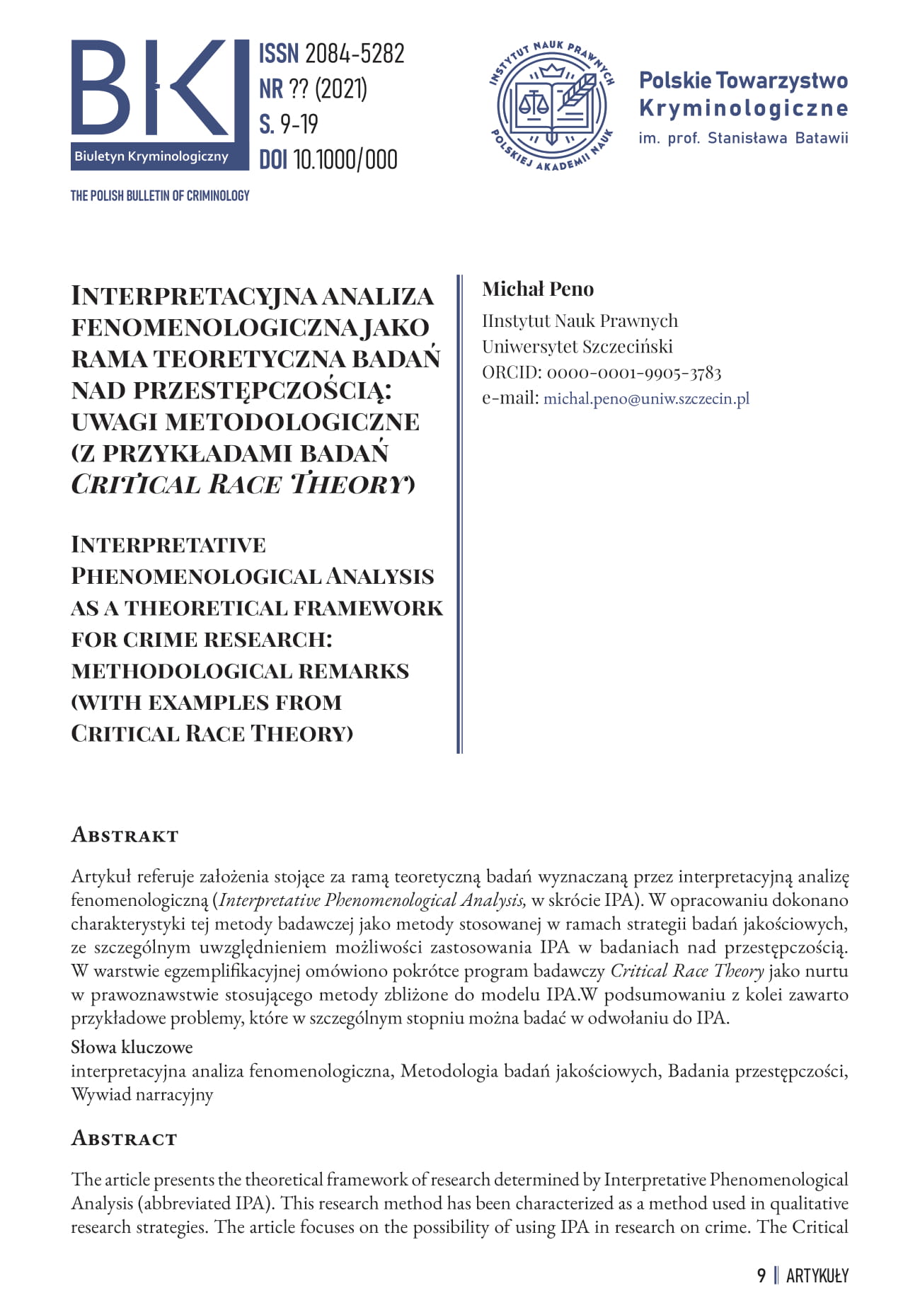 The article presents the theoretical framework of research determined by Interpretative Phenomenological Analysis (abbreviated IPA). This research method has been characterized as a method used in qualitative research strategies. The article focuses on the possibility of using IPA in research on crime. The Critical Race Theory (CRT) research program. CRT is a research and intellectual perspective in legal sciences using methods similar to the IPA model is also briefly discussed. The summary of the article contains examples of problems that can be investigated with IPA.