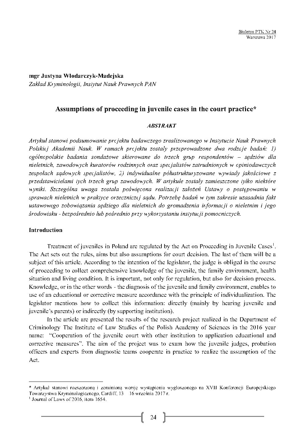 Article is a summary of the research project realized in The Institute of Law Studies of the PolishAcademy of Sciences. In the course of project, there were conducted national surveys addressed to juvenile judges, professional family probation officers, experts from diagnostic teams and the individual in-depth interviews with selected representatives of these groups. The aim of the article is to present the results of the researches, the mainly the answer on the question how do juvenile courts realize in practice the assumptions of the Act on Proceeding in Juvenile Cases. Researches, in the application of law, have been considered particularly important because the law obliges the juvenile judges to collect information about juvenile and his/her environment – directly or indirectly (by supporting institutions).