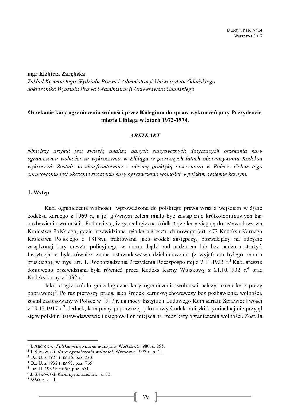 Niniejszy artykuł jest zwięzłą analizą danych statystycznych dotyczących orzekania kary ograniczenia wolności za wykroczenia w Elblągu w pierwszych latach obowiązywania Kodeksu wykroczeń. Zostało to skonfrontowane z obecną praktyką orzeczniczą w Polsce. Celem tego opracowania jest ukazanie znaczenia kary ograniczenia wolności w polskim systemie karnym.