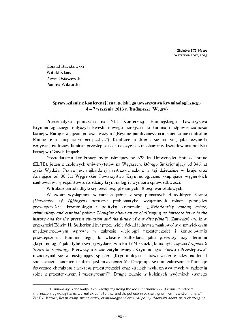 Nr 20 (2013) Sprawozdania Sprawozdanie z konferencji europejskiego towarzystwa kryminologicznego 4 – 7 września 2013 r. Budapeszt (Węgry) PDF Konrad Buczkowski, Witold Klaus, Paweł Ostaszewski, Paulina Wiktorska Opublikowane 17.04.2023 Prawa autorskie (c) 2022 INP PAN Utwór dostępny jest na licencji Creative Commons Uznanie autorstwa 4.0 Międzynarodowe. Jak cytować Sprawozdanie z konferencji europejskiego towarzystwa kryminologicznego 4 – 7 września 2013 r. Budapeszt (Węgry). (2023). Biuletyn Kryminologiczny, 20, 93-99. https://czasopisma.inp.pan.pl/index.php/bk/article/view/3275 Formaty cytowań ACM ACS APA ABNT Chicago (autor-data) Harvard IEEE MLA Turabian Vancouver AMA Pobierz cytowania Endnote/Zotero/Mendeley (RIS) BibTeX PDF Bibliografia Kerner H.-J., Abstact. Relationship among crime, criminology and criminal policy: Thoughts about an as challenging as intricate issue in the history and for the present situation and the future of our discipline, [w:] Beyond Punitiveness: Crime and Crime Control in Europe in a Comparative Perspective. Book of Abstracts, Budapest 2013. Ollus N., Jokinen A., Joutsen M. (red.), Exploitation of migrant workers in Finland, Sweden, Estonia and Lithuania: Uncovering the links between recruitment, irregular employment practices and labour trafficking, European Institute for Crime Prevention and Control, Helsinki 2013, http://www.heuni.fi/Etusivu/Publications/1368802816918 [dostęp: 2013].