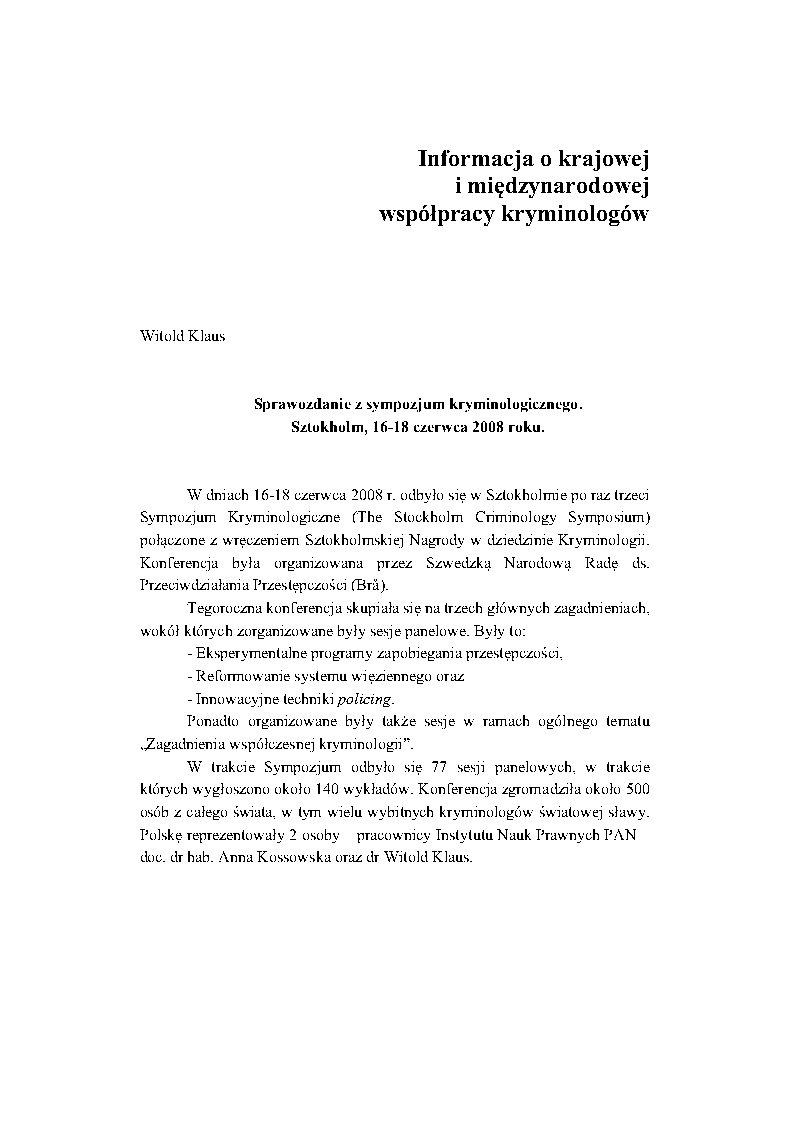Nr 17 (2008) Sprawozdania Sprawozdanie z sympozjum kryminologicznego. Sztokholm, 16-18 czerwca 2008 roku PDF Witold Klaus Opublikowane 22.02.2022 Prawa autorskie (c) 2022 INP PAN Utwór dostępny jest na licencji Creative Commons Uznanie autorstwa 4.0 Międzynarodowe. Jak cytować Sprawozdanie z sympozjum kryminologicznego. Sztokholm, 16-18 czerwca 2008 roku. (2022). Biuletyn Kryminologiczny, 17, 40-42. https://czasopisma.inp.pan.pl/index.php/bk/article/view/3294 Formaty cytowań ACM ACS APA ABNT Chicago (autor-data) Harvard IEEE MLA Turabian Vancouver AMA Pobierz cytowania Endnote/Zotero/Mendeley (RIS) BibTeX PDF Bibliografia Fajst M., Kryminologiczny Nobel 2008, „Biuletyn Polskiego Towarzystwa” 2007, nr 16, s. 73–80. Olewus D., Mobbing. Fala przemocy w szkole – jak ją powstrzymać?, Jacek Santorski & Co Agencja Wydawnicza, Warszawa 2007. Skiba R., Are zero tolerance policies effective in the schools? An evidentiary review and recommendations, http://www.apa.org/ed/cpse/zttfreport.pdf [dostęp: 2008].