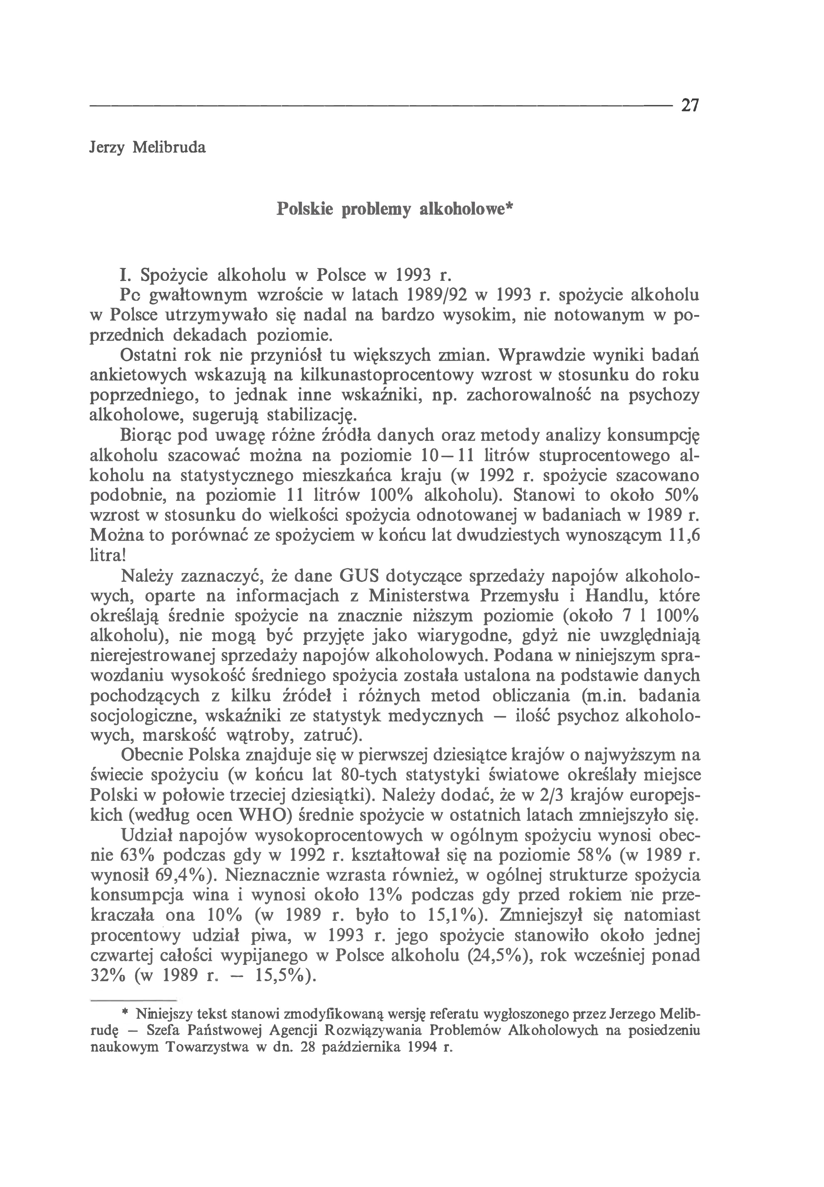 PG gwałtownym wzroście w latach 1989/92 w 1993 r. spożycie alkoholu w Polsce utrzymywało się nadal na bardzo wysokim, nie notowanym w poprzednich dekadach poziomie.