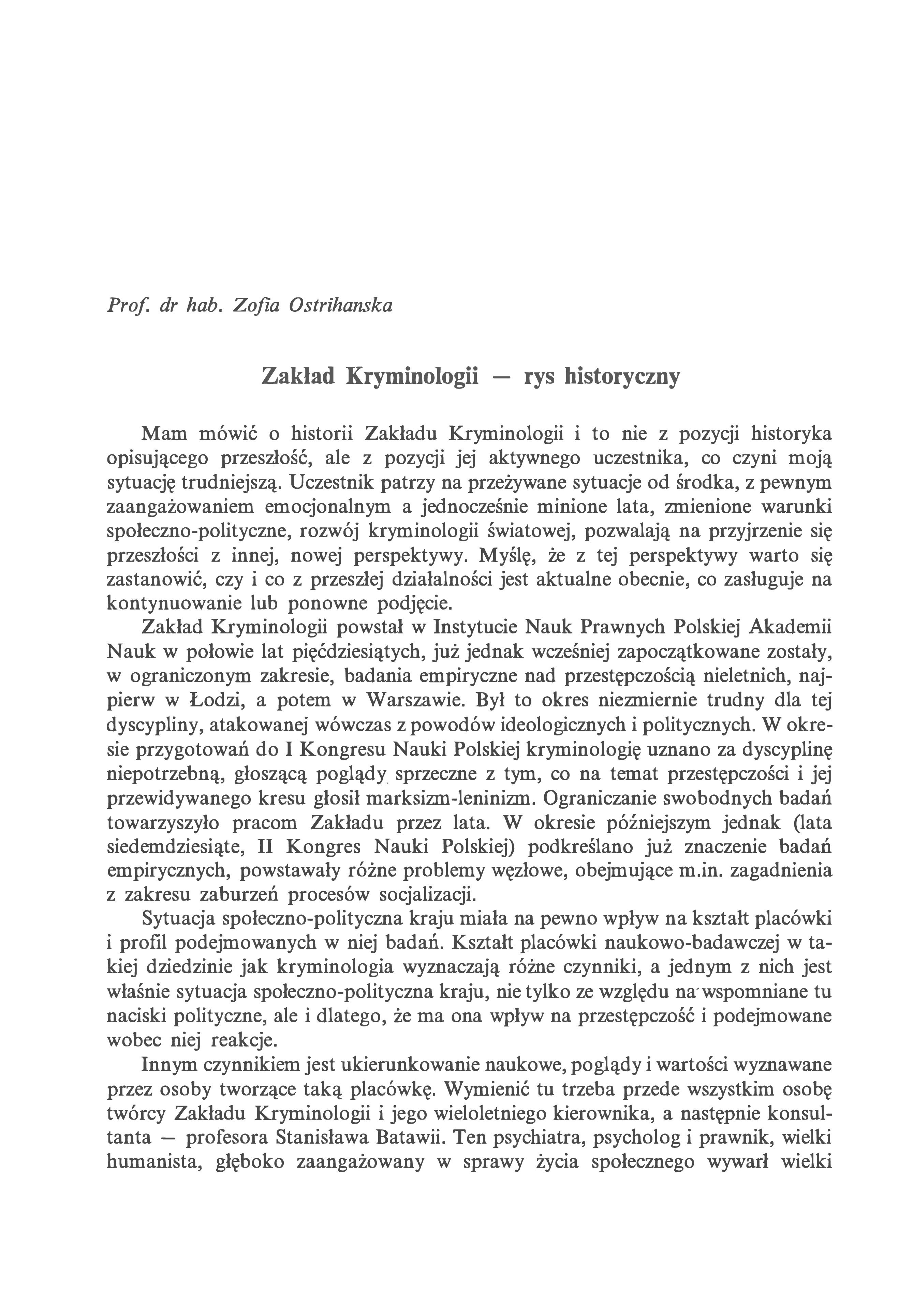 Zakład Kryminologii powstał w Instytucie Nauk Prawnych Polskiej Akademii Nauk w połowie lat pięćdziesiątych, już jednak wcześniej zapoczątkowane zostały, w ograniczonym zakresie, badania empiryczne nad przestępczością nieletnich, najpierw w Łodzi, a potem w Warszawie. Był to okres niezmiernie trudny dla tej dyscypliny, atakowanej wówczas z powodów ideologicznych i politycznych. W okresie przygotowań do I Kongresu Nauki Polskiej kryminologię uznano za dyscyplinę niepotrzebną, głoszącą poglądy sprzeczne z tym, co na temat przestępczości i jej przewidywanego kresu głosił marksizm-leninizm. Ograniczanie swobodnych badań towarzyszyło pracom Zakładu przez lata. W okresie późniejszym jednak (lata siedemdziesiąte, II Kongres Nauki Polskiej) podkreślano już znaczenie badań empirycznych, powstawały różne problemy węzłowe, obejmujące m.in. zagadnienia z zakresu zaburzeń procesów socjalizacji.