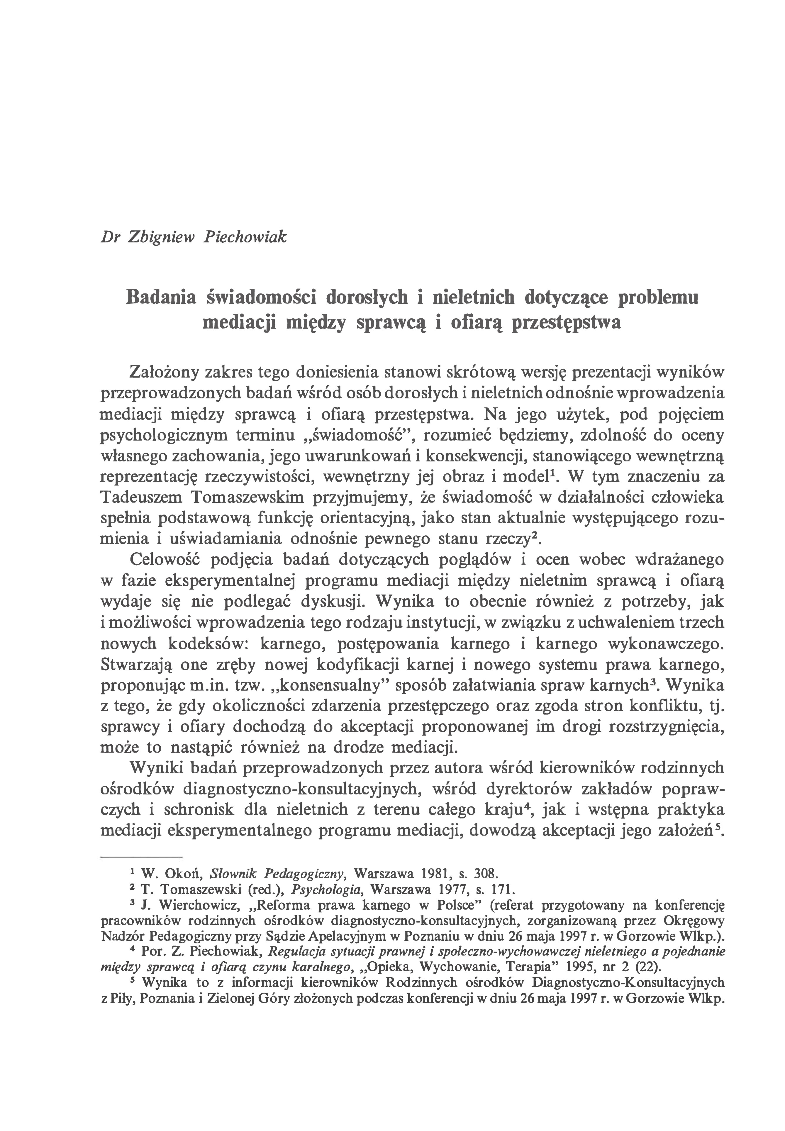 - Piechowiak Z., Regulacja sytuacji prawnej i społeczno-wychowawczej nieletniego a pojednanie między sprawcą i ofiarą czynu karalnego, „Opieka, Wychowanie, Terapia” 1995, nr 2, s. 22.