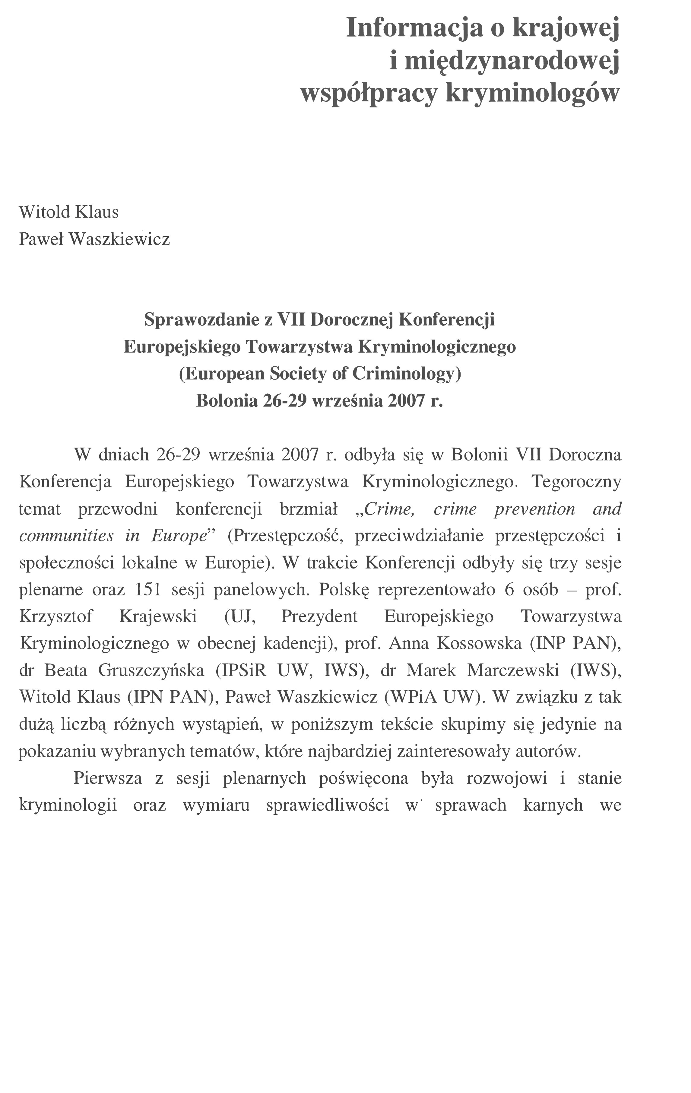 Nr 16 (2007) Sprawozdania Sprawozdanie z VII Dorocznej Konferencji Europejskiego Towarzystwa Kryminologicznego (European Society of Criminology) Bolonia 26-29 września 2007 r. PDF Witold Klaus, Paweł Waszkiewicz Opublikowane 19.04.2007 Prawa autorskie (c) 2022 INP PAN Utwór dostępny jest na licencji Creative Commons Uznanie autorstwa 4.0 Międzynarodowe. Jak cytować Sprawozdanie z VII Dorocznej Konferencji Europejskiego Towarzystwa Kryminologicznego (European Society of Criminology) Bolonia 26-29 września 2007 r. (2007). Biuletyn Kryminologiczny, 16, 67-72. https://czasopisma.inp.pan.pl/index.php/bk/article/view/3421 Formaty cytowań ACM ACS APA ABNT Chicago (autor-data) Harvard IEEE MLA Turabian Vancouver AMA Pobierz cytowania Endnote/Zotero/Mendeley (RIS) BibTeX PDF Bibliografia Beijerse J. uit, Swaaningen R. van, The Netherlands: Penal welfarism and risk management [w:] J. Muncie, B. Goldson (red.), Comparative Youth Justice, Sage, London, Thousand Oaks, New Delhi 2006, s. 65–78. Gili M., Spriggs A., Assesing the Impact of CCTY, London 2005. Klein M.W., Weerman F.M., Thornberry T.P., Street gang violence in Europe, “European Journal of Criminology” 2003, nr 3, s. 413–437. Muncie J., Youth & Crime, Sage Publications, Thousand Oaks, London, New Delhi 2004. Selmini R., Criminology in Italy, „Criminology in Europe. Newsletter of the European Society of Criminology” 2007, vol. 6, nr 1.