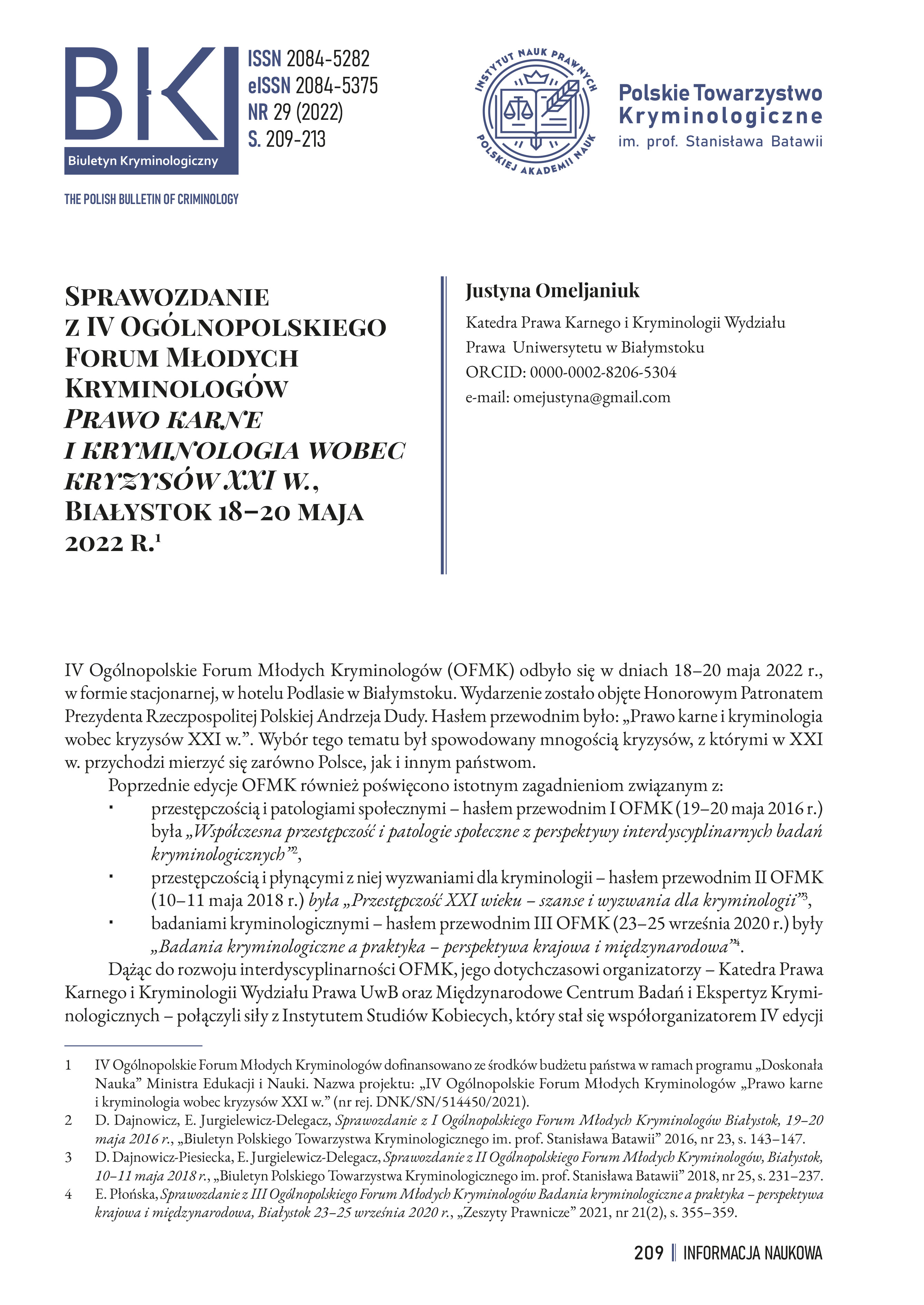 IV Ogólnopolskie Forum Młodych Kryminologów odbyło się w dniach 18-20 maja 2022 r. w Białymstoku. Hasłem przewodnim wydarzenia było: „Prawo karne i kryminologia wobec kryzysów XXI w.”. Wybór tematu był spowodowany mnogością kryzysów, z którymi w XXI w. przychodzi mierzyć się Polsce, jak i innym państwom.