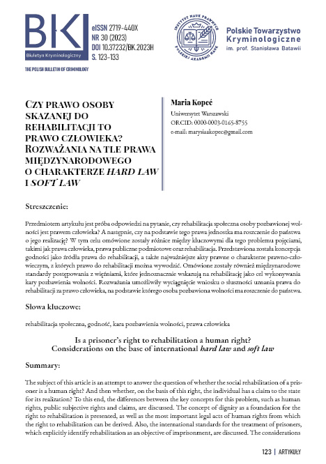 Przedmiotem artykułu jest próba odpowiedzi na pytanie, czy rehabilitacja społeczna osoby pozbawionej wolności jest prawem człowieka? A następnie, czy na podstawie tego prawa jednostka ma roszczenie do państwa o jego realizację? W tym celu omówione zostały różnice między kluczowymi dla tego problemu pojęciami, takimi jak prawa człowieka, prawa publiczne podmiotowe oraz rehabilitacja. Przedstawiona została koncepcja godności jako źródła prawa do rehabilitacji, a także najważniejsze akty prawne o charakterze prawno-człowieczym, z których prawo do rehabilitacji można wywodzić. Omówione zostały również międzynarodowe standardy postępowania z więźniami, które jednoznacznie wskazują na rehabilitację jako cel wykonywania kary pozbawienia wolności. Rozważania umożliwiły wyciągnięcie wniosku o słuszności uznania prawa do rehabilitacji za prawo człowieka, na podstawie którego osoba pozbawiona wolności ma roszczenie do państwa.