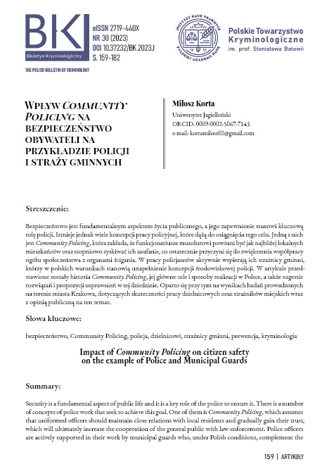 Bezpieczeństwo jest fundamentalnym aspektem życia publicznego, a jego zapewnienie stanowi kluczową rolę policji. Istnieje jednak wiele koncepcji pracy policyjnej, które dążą do osiągnięcia tego celu. Jedną z nich jest Community Policing, która zakłada, że funkcjonariusze mundurowi powinni być jak najbliżej lokalnych mieszkańców oraz stopniowo zyskiwać ich zaufanie, co ostatecznie przyczyni się do zwiększenia współpracy ogółu społeczeństwa z organami ścigania. W pracy policjantów aktywnie wspierają ich strażnicy gminni, którzy w polskich warunkach stanowią uzupełnienie koncepcji środowiskowej policji. W artykule przedstawione zostały historia Community Policing, jej główne cele i sposoby realizacji w Polsce, a także sugestie rozwiązań i propozycji usprawnień w tej dziedzinie. Oparto się przy tym na wynikach badań prowadzonych na terenie miasta Krakowa, dotyczących skuteczności pracy dzielnicowych oraz strażników miejskich wraz z opinią publiczną na ten temat.