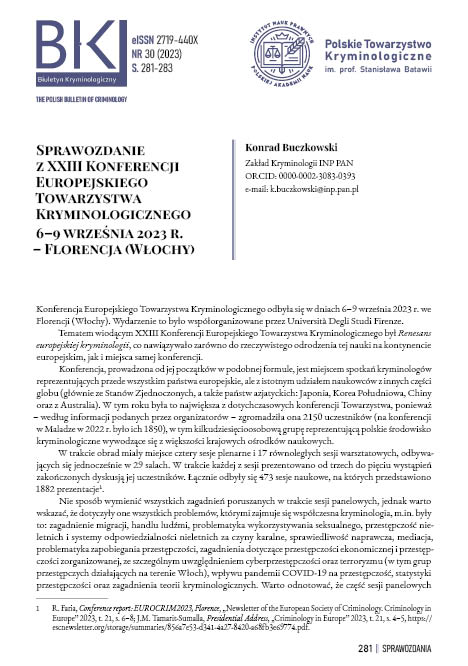 Tekst stanowi sprawozdanie z XXIII Konferencji Europejskiego Towarzystwa Kryminologicznego, które odbyło się w dniach 6 – 9 września 2023 r. - Florencja (Włochy).