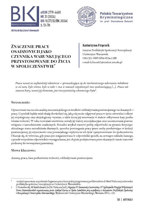 [The study aims to analyse the importance of one of the means of penitentiary influence on convicts - work. The reader will have the opportunity to find out what role work can play in human life and discover its sociological and axiological dimension, as well as the essence of its application during a prison sentence. In the course of the deliberations, its rehabilitation values and legal norms related to the employment of prisoners are discussed. Moreover, the article attempts to answer questions concerning the current state of employment of convicts, the perception of work by persons in penitentiary isolation, its usefulness and potential impact on their lives and adaptation to society. It turns out that when work is organised in an appropriate manner, outside the prison and, above all, adequately remunerated, it is willingly undertaken by convicts and can be the basis for internal transformation.]