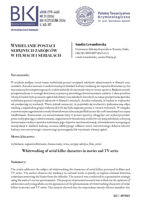 W artykule podjęty został temat wybielania postaci seryjnych zabójców ukazywanych w filmach oraz serialach. Autorka zauważa w dziełach kultury tendencję do usprawiedliwiania czy tłumaczenia zachowań przestępczych, a także niekiedy do znoszenia winy ze sprawcy. Badania zostały przeprowadzone w strategii ilościowej za pomocą autorskiego kwestionariusza ankiety. Celem przedstawionych badań było poznanie opinii młodzieży oraz młodych dorosłych na temat przejawiania zjawiska wybielania postaci seryjnych zabójców w filmach i serialach. Analiza wykazała, że badani w większości nie przejawiają tej tendencji. Warto jednak zaznaczyć, że pojawiały się trudności z jednoznaczną odpowiedzią, a najmłodsza grupa wiekowa (13-15 lat) była najmniej pewną w swoich wyborach. W związku z zauważonym zagrożeniem, zostały sformułowane zalecenia profilaktyczne dla osób narażonych na usprawiedliwianie, tłumaczenie czy niezauważanie winy w postaci sprawcy. Mogą być one wykorzystywane przez osoby pracujące z adolescentami, organizatorów kształcenia, rodziców czy samą młodzież, a dotyczą dostarczania wiedzy o zjawisku wybielania, jego objawów oraz konsekwencji, uświadamiania o występującej manipulacji w dziełach kultury, uczenia refleksyjnego odbioru treści, wartościowego doboru tekstów kultury oraz asertywnego i stanowczego postrzegania lub wyrażania własnej opinii.