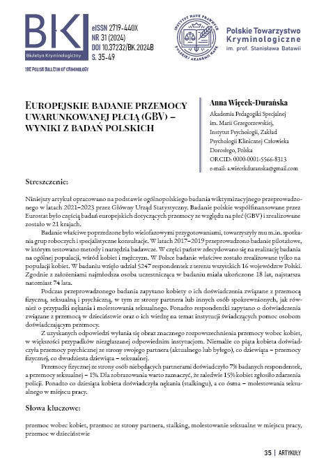 Europejskie badanie przemocy uwarunkowanej płcią (GBV) - wyniki z badań polskich: European survey on gender-based violence (GBV) – results from Polish research. (2025). Biuletyn Kryminologiczny, 31, 35-49. https://doi.org/10.37232/BK.2024B