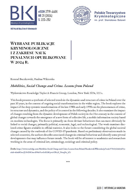 Nr 31 (2024) Varia Wybrane publikacje kryminologiczne i z zakresu nauk penalnych opublikowane w 2024 r. Selected criminology and penal science publications published in 2024 PDF Paweł Ostaszewski more info Paweł Ostaszewski Universtity of Warsaw Opublikowane 23.06.2025 Prawa autorskie (c) 2025 Paweł Ostaszewski Utwór dostępny jest na licencji Creative Commons Uznanie autorstwa 4.0 Międzynarodowe. Jak cytować Wybrane publikacje kryminologiczne i z zakresu nauk penalnych opublikowane w 2024 r.: Selected criminology and penal science publications published in 2024. (2025). Biuletyn Kryminologiczny, 31, 223-252. https://doi.org/10.37232/ Formaty cytowań ACM ACS APA ABNT Chicago (autor-data) Harvard IEEE MLA Turabian Vancouver AMA Pobierz cytowania Endnote/Zotero/Mendeley (RIS) BibTeX PDF