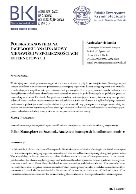 W niniejszym artykule poruszam zagadnienie mowy nienawiści, dyskryminacji i victim blamingu w polskiej manosferze – internetowej przestrzeni zrzeszającej mężczyzn, którzy czują zagrożenie w związku z zachodzącymi współcześnie przemianami ról płciowych. Celem przeprowadzonych badań jest zidentyfikowanie skali oraz charakteru tych zjawisk w treściach publikowanych na polskich grupach manosfery w serwisie Facebook. Na podstawie analizy ilościowej i jakościowej komentarzy oraz postów zidentyfikowałam dominujące narracje oraz ich eskalację. Badania ukazują nie tylko skalę negatywnych zachowań w polskiej manosferze, lecz także to, jakie czynniki wpływają na ich występowanie. Artykuł kończę omówieniem wyników, wskazaniem ograniczeń w badaniach oraz rekomendacjami dotyczącymi przeciwdziałania eskalacji mowy nienawiści w przestrzeni internetowej.