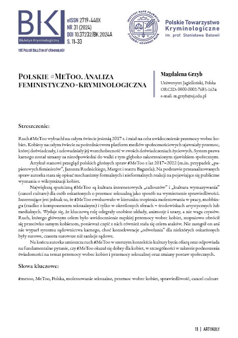 The greatest legacy of #MeToo is the culture of online callouts and „cancel culture” for the people accused of sexual violence as a way of doing justice. However, the interesting point is that #MeToo evolved into tracing harassment at work, mobbing (rarely with any sexual component), and only in specific realms – artistic milieus or elite professions like journalism. It seems that personal arrangements favors, injuries, and acts of vengeance played a crucial role rather than the gravity of deeds. A movement that was primarily aimed at making visible male violence against women turned out against women themselves since a lot of women have been targeted by callouts. It did not either replace or supplant the criminal justice system, albeit the consequences of „cancelling” for some accused were harsh, sometimes harsher than judicial sanctions.]