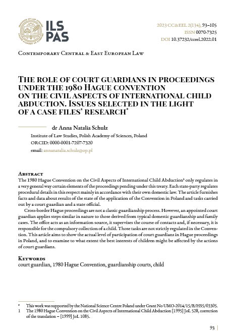 The role of court guardians in proceedings under the 1980 Hague convention on the civil aspects of international child abduction. Issues selected in the light of a case files’ research. (2023). Contemporary Central & East European Law, 2 (134), 93–105. https://doi.org/10.37232/cceel.2022.01