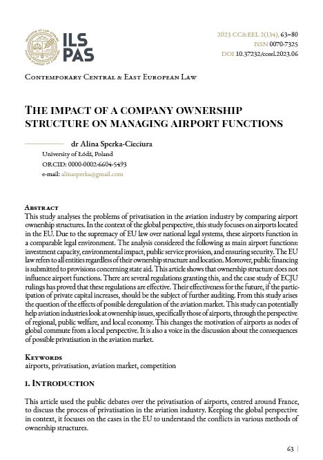 This study analyses the problems of privatisation in the aviation industry by comparing airport ownership structures. In the context of the global perspective, this study focuses on airports located in the EU. Due to the supremacy of EU law over national legal systems, these airports function in a comparable legal environment. The analysis considered the following as main airport functions: investment capacity, environmental impact, public service provision, and ensuring security. The EU law refers to all entities regardless of their ownership structure and location. Moreover, public financing is submitted to provisions concerning state aid. This article shows that ownership structure does not influence airport functions. There are several regulations granting this, and the case study of ECJU rulings has proved that these regulations are effective. Their effectiveness for the future, if the participation of private capital increases, should be the subject of further auditing. From this study arises the question of the effects of possible deregulation of the aviation market. This study can potentially help aviation industries look at ownership issues, specifically those of airports, through the perspective of regional, public welfare, and local economy. This changes the motivation of airports as nodes of global commute from a local perspective. It is also a voice in the discussion about the consequences of possible privatisation in the aviation market.