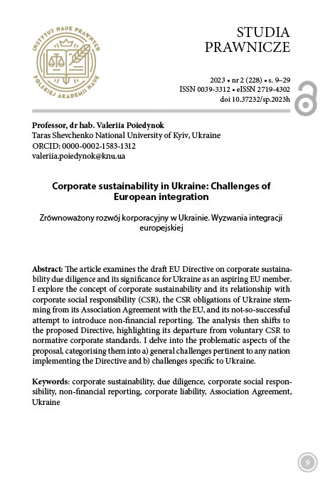 The article examines the draft EU Directive on corporate sustainability due diligence and its significance for Ukraine as an aspiring EU member. I explore the concept of corporate sustainability and its relationship with the corporate social responsibility, the CSR obligations of Ukraine stemming from its Association Agreement with the EU, and its not-so-successful attempt to introduce the non-financial reporting. The analysis then shifts to the proposed Directive, highlighting its departure from voluntary CSR to normative corporate standards. I delve into the problematic aspects of the proposal, categorizing them into: a) general challenges pertinent to any nation implementing the Directive, and b) challenges specific to Ukraine.