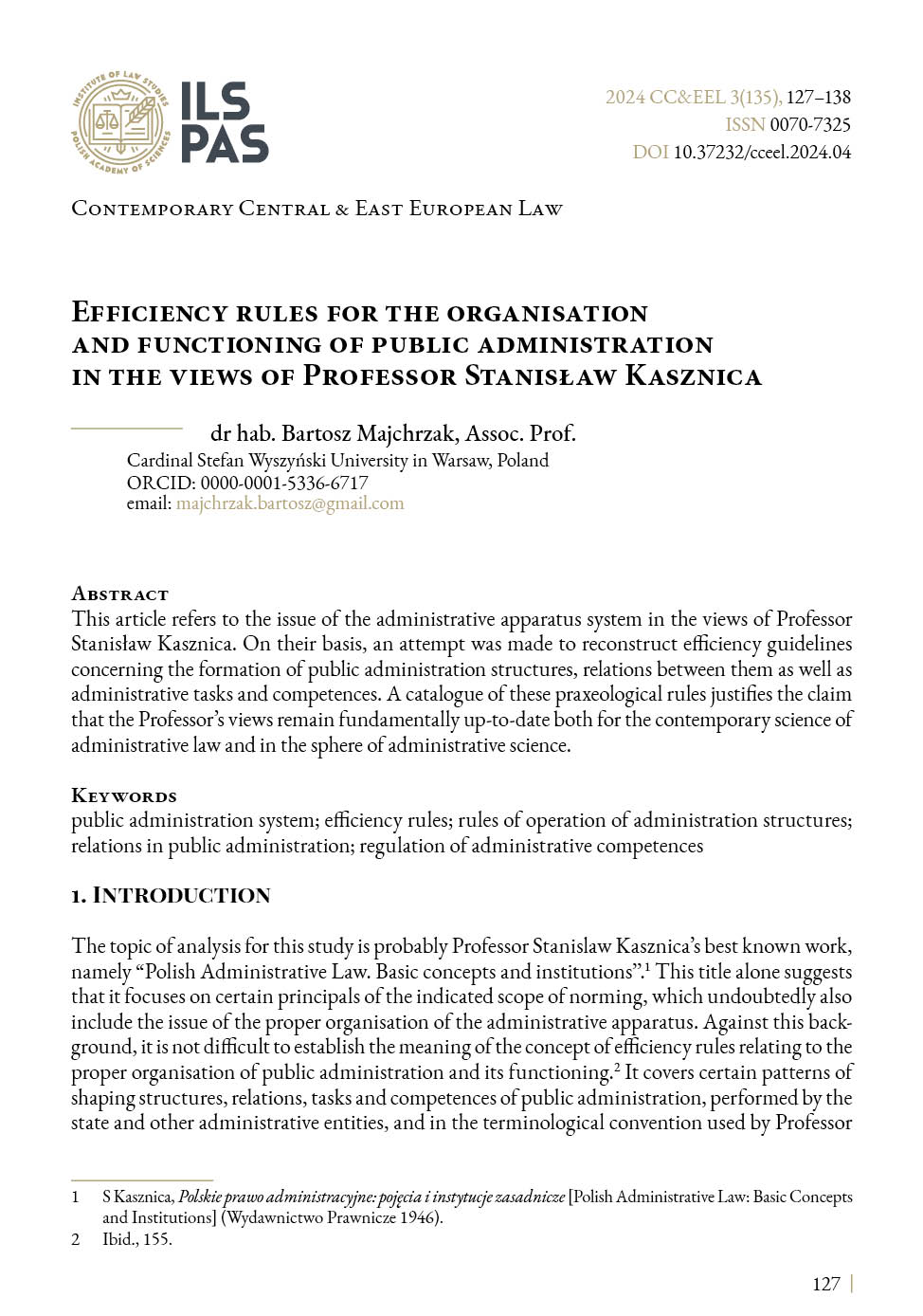 This article refers to the issue of the administrative apparatus system in the views of Professor Stanisław Kasznica. On their basis, an attempt was made to reconstruct efficiency guidelines concerning the formation of public administration structures, relations between them as well as administrative tasks and competences. A catalogue of these praxeological rules justifies the claim that the Professor’s views remain fundamentally up-to-date both for the contemporary science of administrative law and in the sphere of administrative science.
