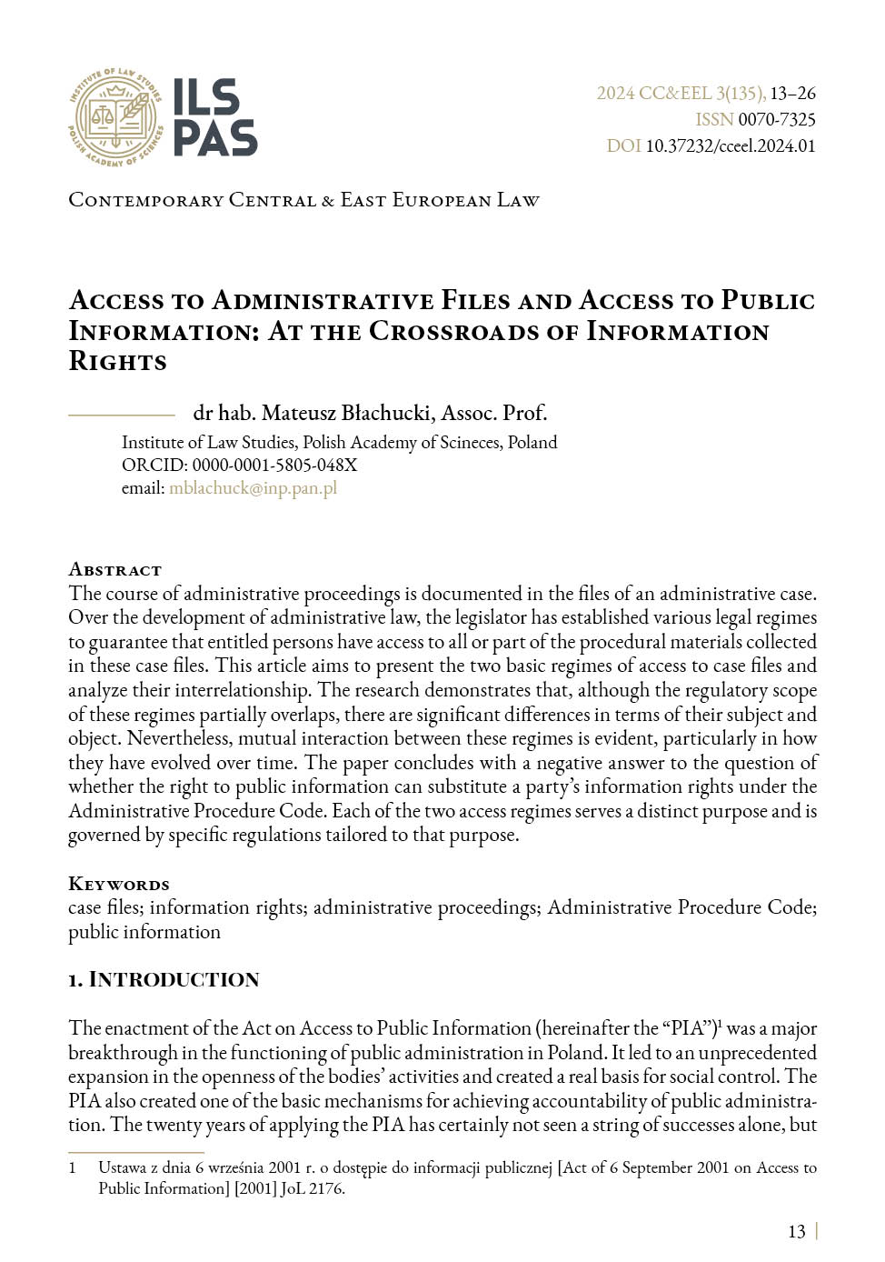 The course of administrative proceedings is documented in the files of an administrative case. Over the development of administrative law, the legislator has established various legal regimes to guarantee that entitled persons have access to all or part of the procedural materials collected in these case files. This article aims to present the two basic regimes of access to case files and analyze their interrelationship. The research demonstrates that, although the regulatory scope of these regimes partially overlaps, there are significant differences in terms of their subject and object. Nevertheless, mutual interaction between these regimes is evident, particularly in how they have evolved over time. The paper concludes with a negative answer to the question of whether the right to public information can substitute a party’s information rights under the Administrative Procedure Code. Each of the two access regimes serves a distinct purpose and is governed by specific regulations tailored to that purpose.