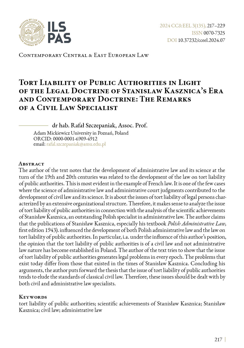 The author of the text notes that the development of administrative law and its science at the turn of the 19th and 20th centuries was related to the development of the law on tort liability of public authorities. This is most evident in the example of French law. It is one of the few cases where the science of administrative law and administrative court judgments contributed to the development of civil law and its science. It is about the issues of tort liability of legal persons characterized by an extensive organizational structure. Therefore, it makes sense to analyze the issue of tort liability of public authorities in connection with the analysis of the scientific achievements of Stanisław Kasznica, an outstanding Polish specialist in administrative law. The author claims that the publications of Stanisław Kasznica, especially his textbook Polish Administrative Law, first edition 1943). influenced the development of both Polish administrative law and the law on tort liability of public authorities. In particular, i.a. under the influence of this author’s position, the opinion that the tort liability of public authorities is of a civil law and not administrative law nature has become established in Poland. The author of the text tries to show that the issue of tort liability of public authorities generates legal problems in every epoch. The problems that exist today differ from those that existed in the times of Stanisław Kasznica. Concluding his arguments, the author puts forward the thesis that the issue of tort liability of public authorities tends to elude the standards of classical civil law. Therefore, these issues should be dealt with by both civil and administrative law specialists.