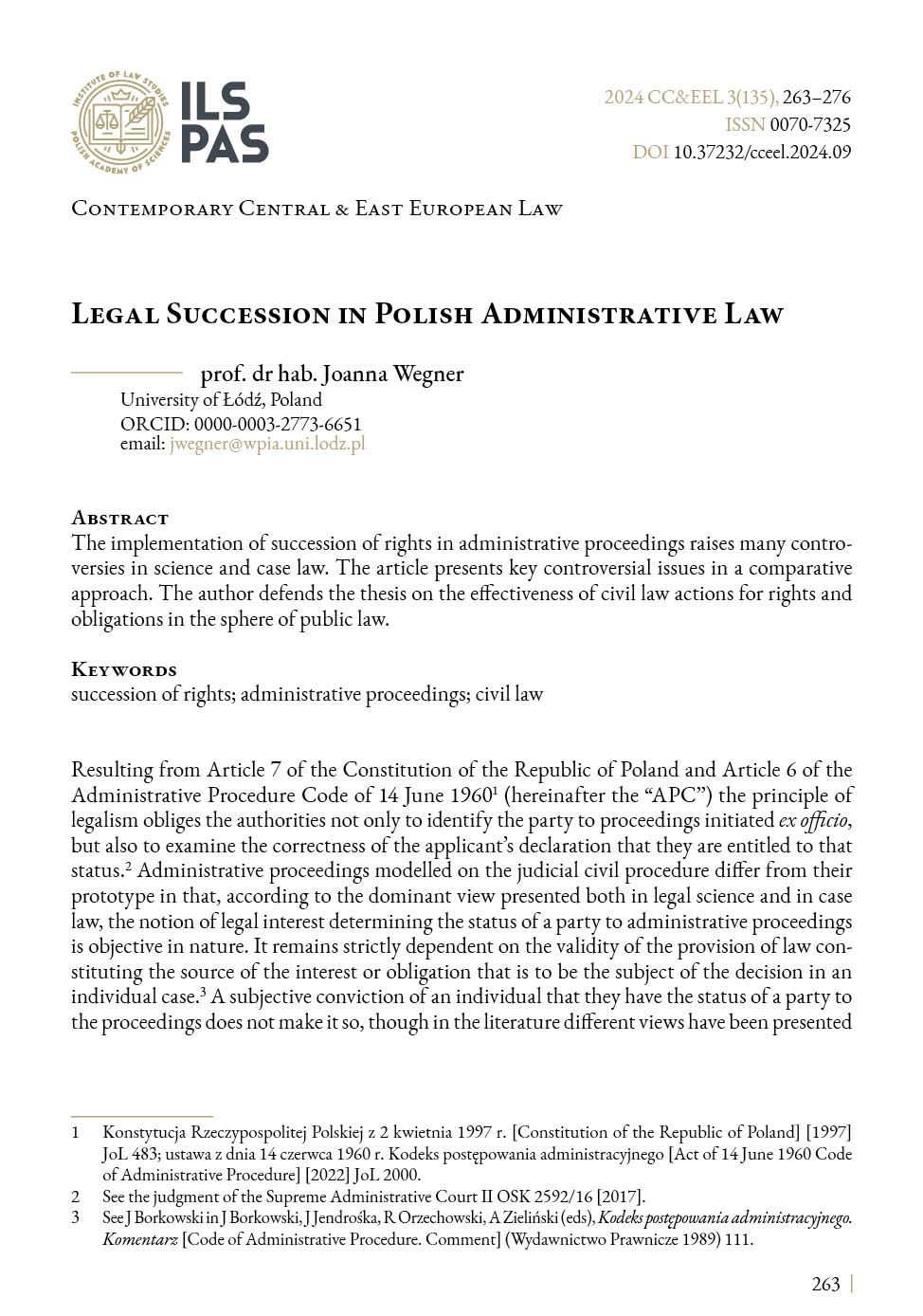 The implementation of succession of rights in administrative proceedings raises many controversies in science and case law. The article presents key controversial issues in a comparative approach. The author defends the thesis on the effectiveness of civil law actions for rights and obligations in the sphere of public law.