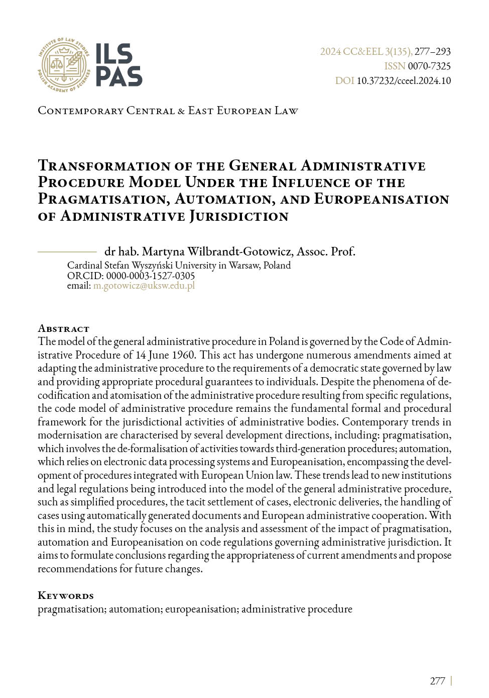 The model of the general administrative procedure in Poland is governed by the Code of Administrative Procedure of 14 June 1960. This act has undergone numerous amendments aimed at adapting the administrative procedure to the requirements of a democratic state governed by law and providing appropriate procedural guarantees to individuals. Despite the phenomena of decodification and atomisation of the administrative procedure resulting from specific regulations, the code model of administrative procedure remains the fundamental formal and procedural framework for the jurisdictional activities of administrative bodies. Contemporary trends in modernisation are characterised by several development directions, including: pragmatisation, which involves the de-formalisation of activities towards third-generation procedures; automation, which relies on electronic data processing systems; and Europeanisation, encompassing the development of procedures integrated with European Union law. These trends lead to new institutions and legal regulations being introduced into the model of the general administrative procedure, such as simplified procedures, the tacit settlement of cases, electronic deliveries, the handling of cases using automatically generated documents and European administrative cooperation. With this in mind, the study focuses on the analysis and assessment of the impact of pragmatisation, automation and Europeanisation on code regulations governing administrative jurisdiction. It aims to formulate conclusions regarding the appropriateness of current amendments and propose recommendations for future changes.