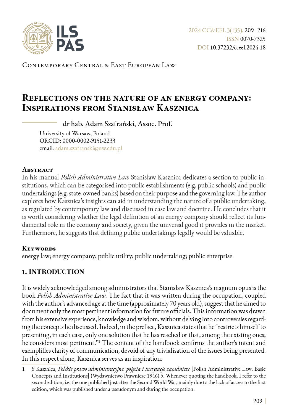 In his manual Polish Administrative Law Stanisław Kasznica dedicates a section to public institutions, which can be categorised into public establishments (e.g. public schools) and public undertakings (e.g. state-owned banks) based on their purpose and the governing law. The author explores how Kasznica’s insights can aid in understanding the nature of a public undertaking, as regulated by contemporary law and discussed in case law and doctrine. He concludes that it is worth considering whether the legal definition of an energy company should reflect its fundamental role in the economy and society, given the universal good it provides in the market. Furthermore, he suggests that defining public undertakings legally would be valuable.