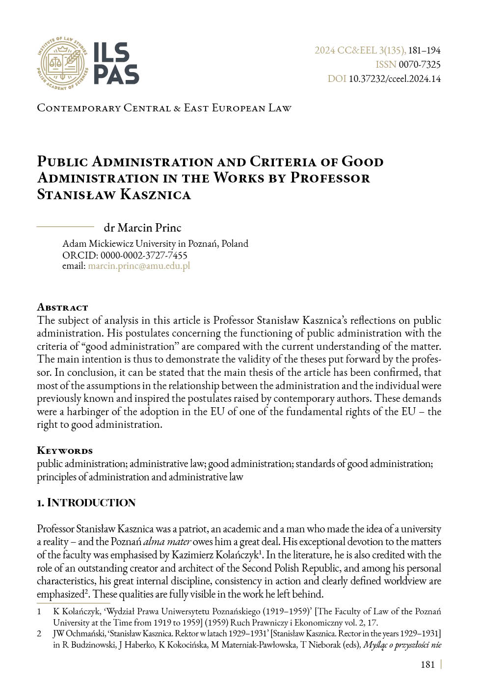 The subject of analysis in this article is Professor Stanisław Kasznica’s reflections on public administration. His postulates concerning the functioning of public administration with the criteria of “good administration” are compared with the current understanding of the matter. The main intention is thus to demonstrate the validity of the theses put forward by the professor. In conclusion, it can be stated that the main thesis of the article has been confirmed, that most of the assumptions in the relationship between the administration and the individual were previously known and inspired the postulates raised by contemporary authors. These demands were a harbinger of the adoption in the EU of one of the fundamental rights of the EU – the right to good administration.