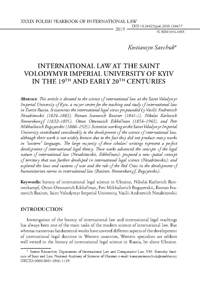 This article is devoted to the science of international law at the Saint Volodymyr Imperial University of Kyiv, a major centre for the teaching and study of international law in Tsarist Russia. It examines the international legal views propounded by Vasilii Andreevich Nezabitovskii (1824–1883), Roman Ivanovich Baziner (1841–?), Nikolai Karlovich Rennenkampf (1832–1899), Otton Ottonovich Eikhel’man (1854–1943), and Petr Mikhailovich Bogayevskii (1866–1929). Scientists working at the Saint Volodymyr Imperial University contributed considerably to the development of the science of international law, although their work is not widely known due to the fact they did not produce many works in “western” languages. The large majority of these scholars’ writings represent a perfect development of international legal theory. These works advanced the concepts of the legal nature of international law (Nezabitovskii, Eikhel’man); proposed a new spatial concept of territory that was further developed in international legal science (Nezabitovskii); and explored the laws and customs of war and the role of the Red Cross in the development of humanitarian norms in international law (Baziner, Rennenkampf, Bogayevskii).
