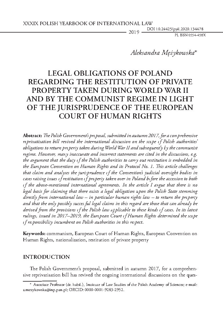cases raising issues of restitution of property taken over in Poland before the accession to both of the above-mentioned international agreements. In the article I argue that there is no legal basis for claiming that there exists a legal obligation upon the Polish State stemming directly from international law – in particular human rights law – to return the property and that the only possibly successful legal claims in this regard are those that can already be derived from the provisions of the Polish law applicable to these kinds of cases. In its latest rulings, issued in 2017–2019, the European Court of Human Rights determined the scope of responsibility incumbent on Polish authorities in this respect.