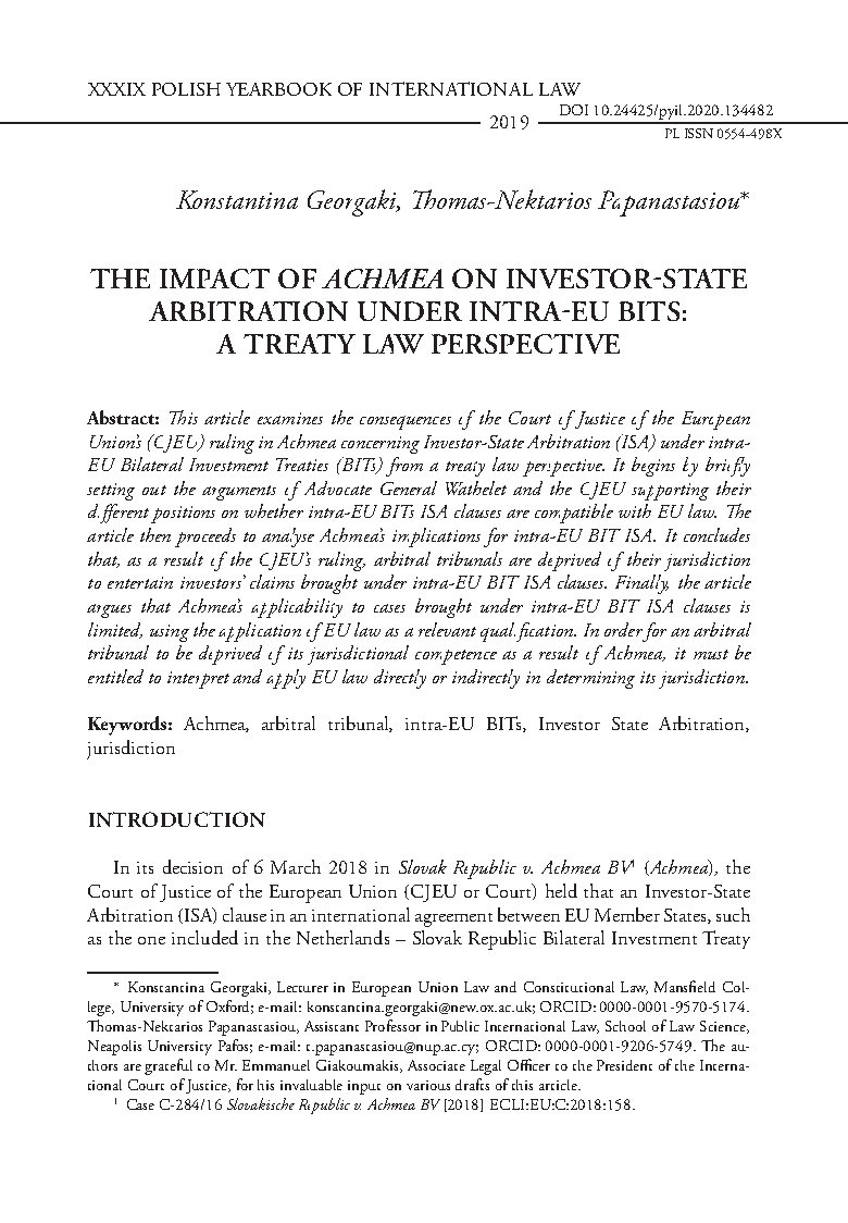 - Gourgourinis A., After Achmea: Maintaining the EU Law Compatibility of Intra-EU BITs Through Treaty Interpretation, 3 European Investment Law and Arbitration Review 282 (2018).